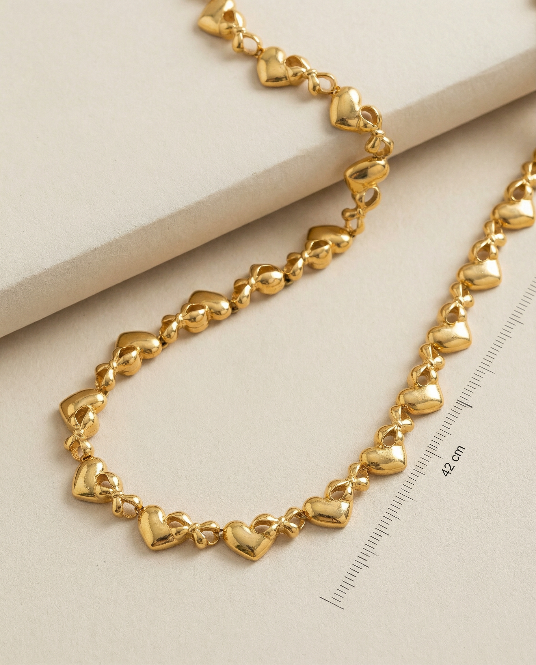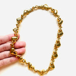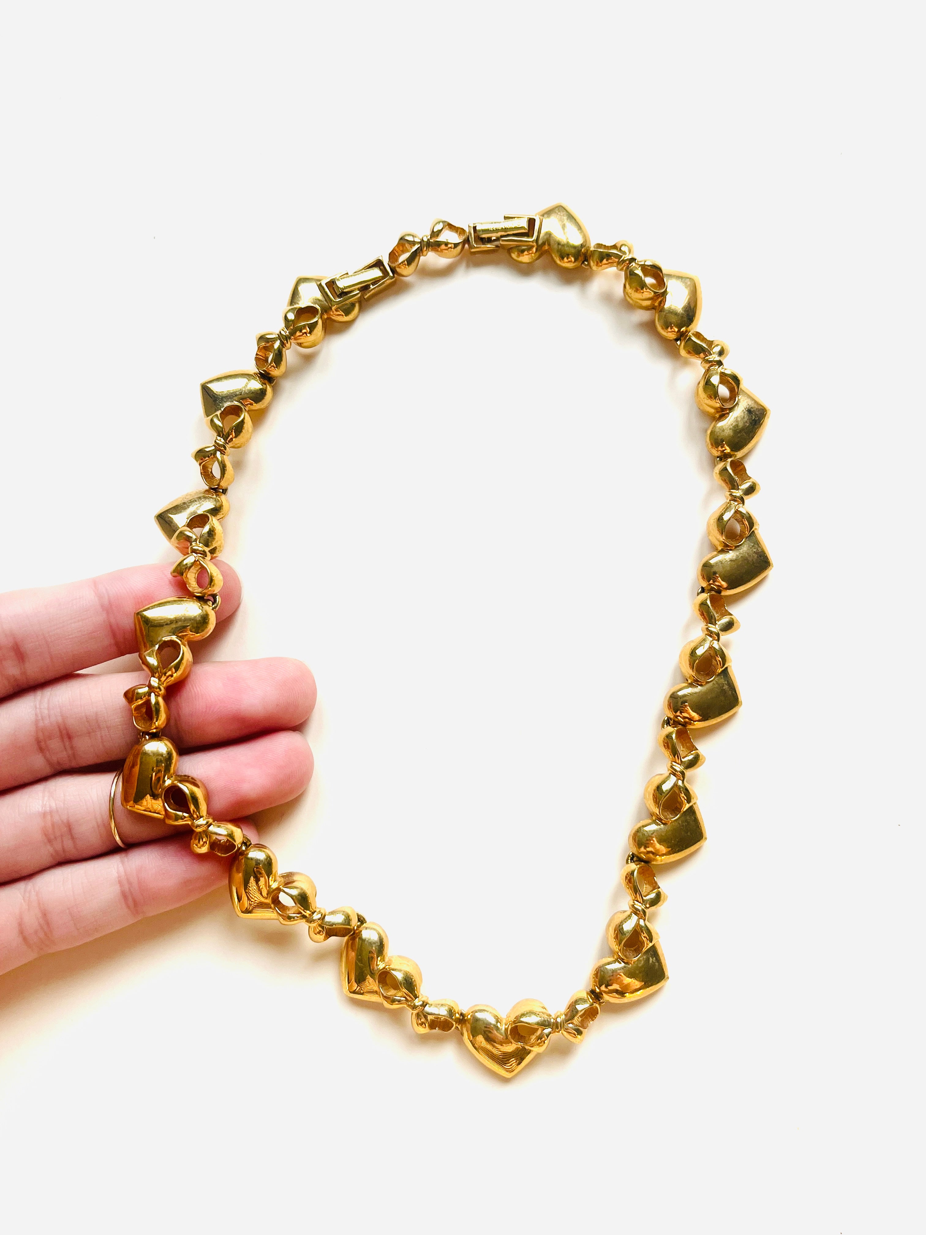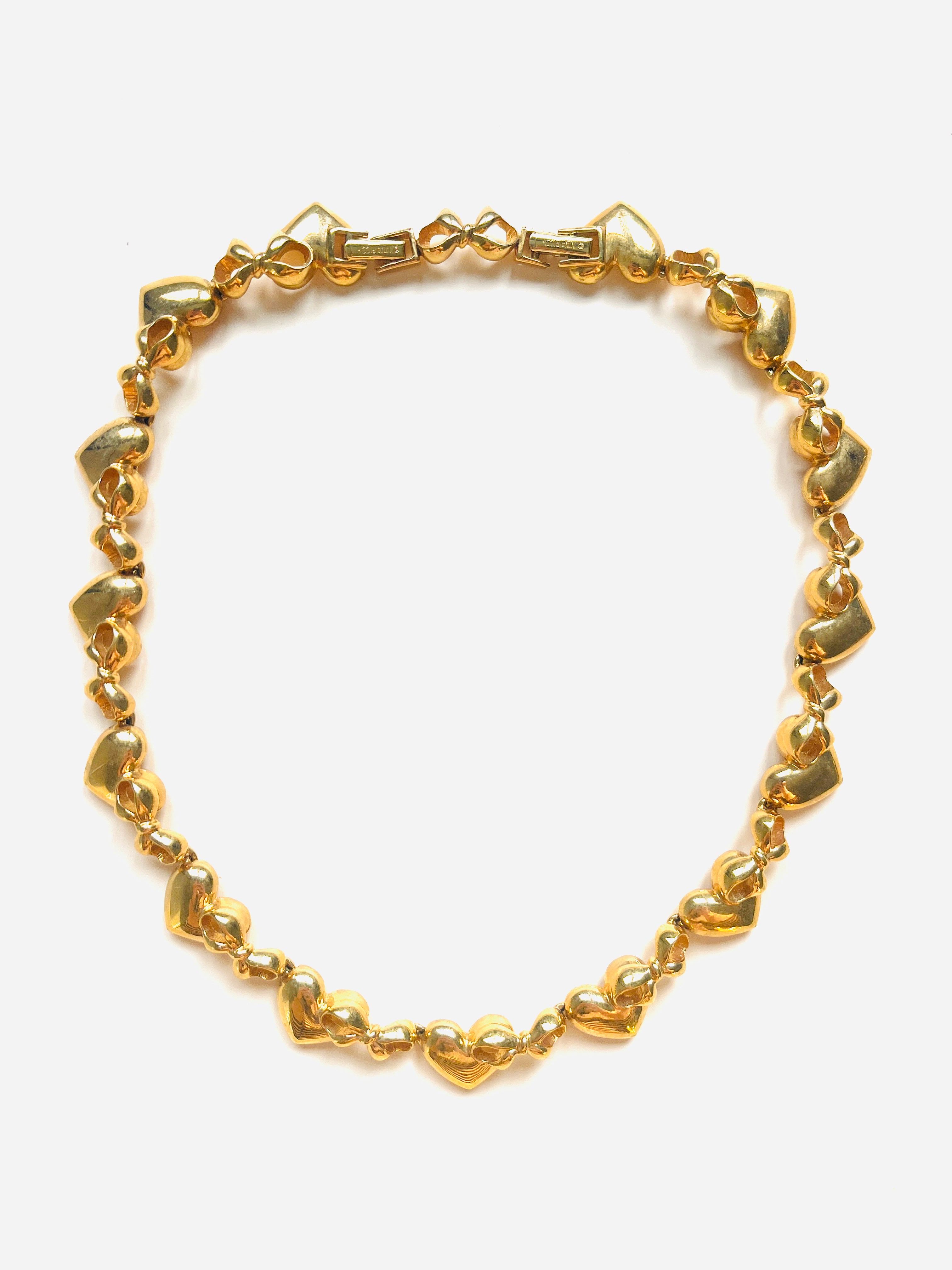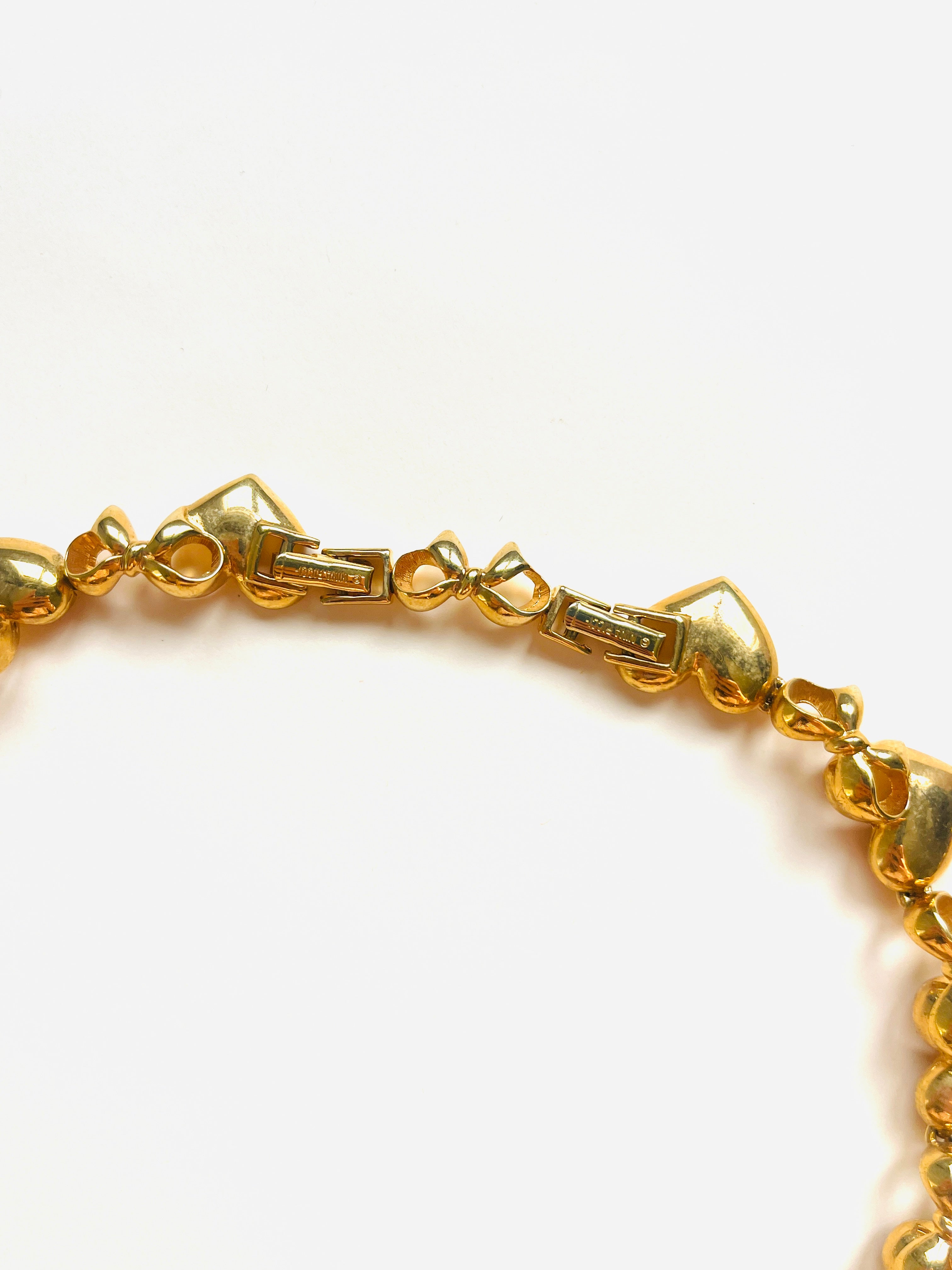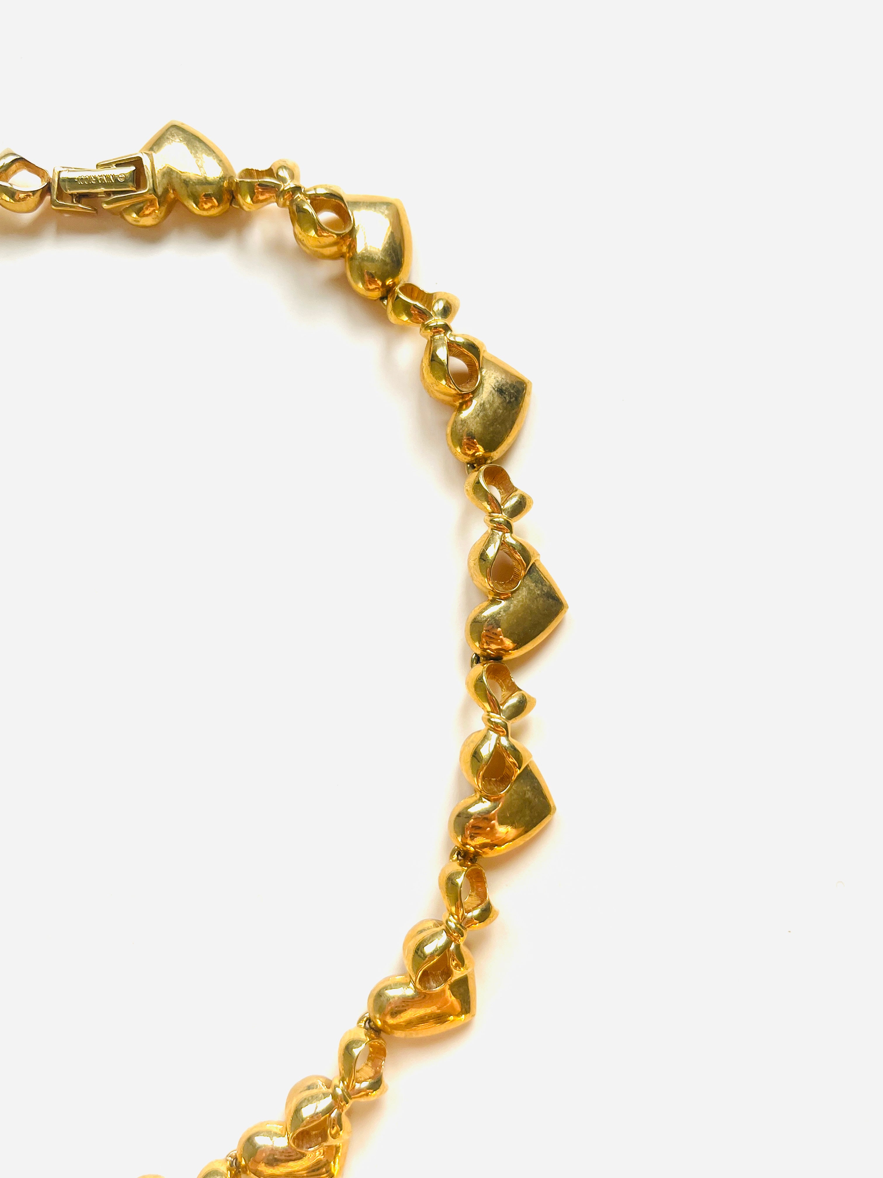 Gargantilla vintage original de la marca Nina Ricci. Base dorada chapado en oro con base dorada, con detalles de lazos y corazones. Cierre doble con el logo característico de la marca, para ajustar el tamaño. Incluye paño de limpieza original de la marca Nina Ricci en color blanco y letras en dorado.