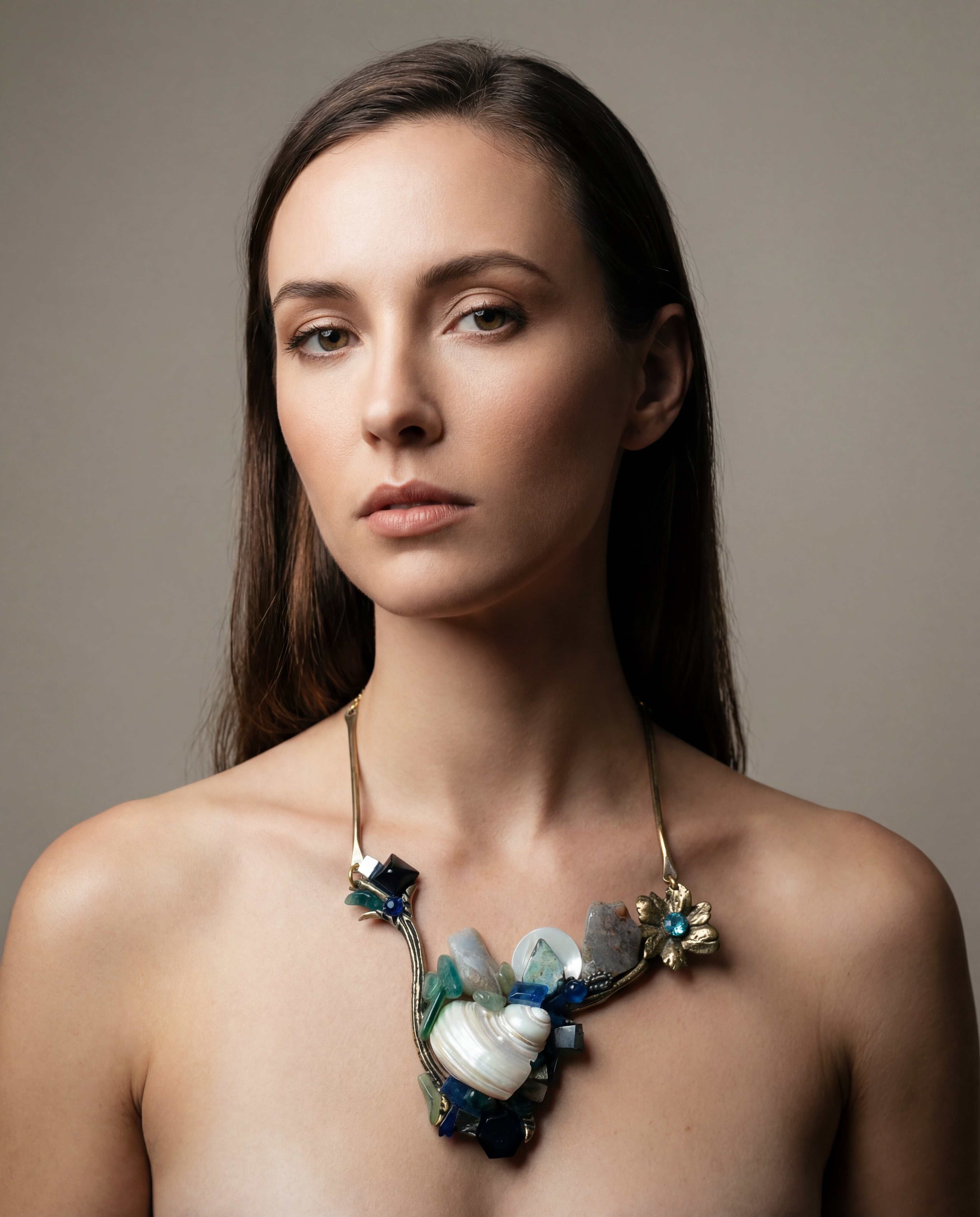 Maxi collar vintage original de los años 90. Base dorada rígida con estructura de minerales naturales, conchas y cristales multicolor.