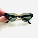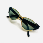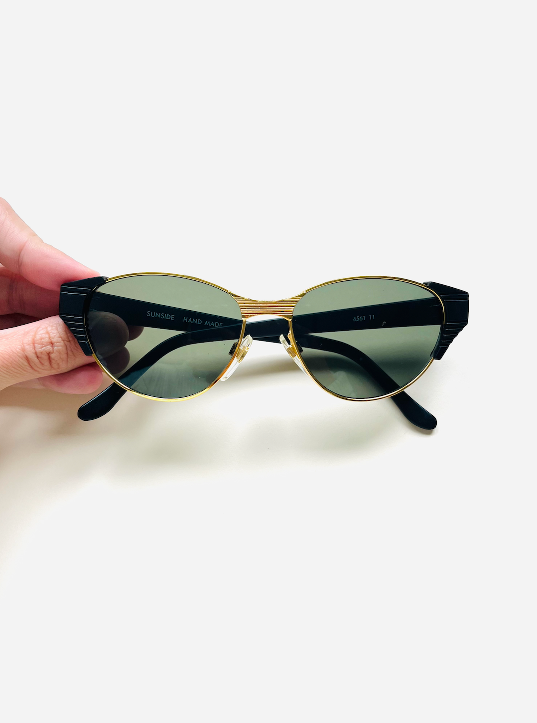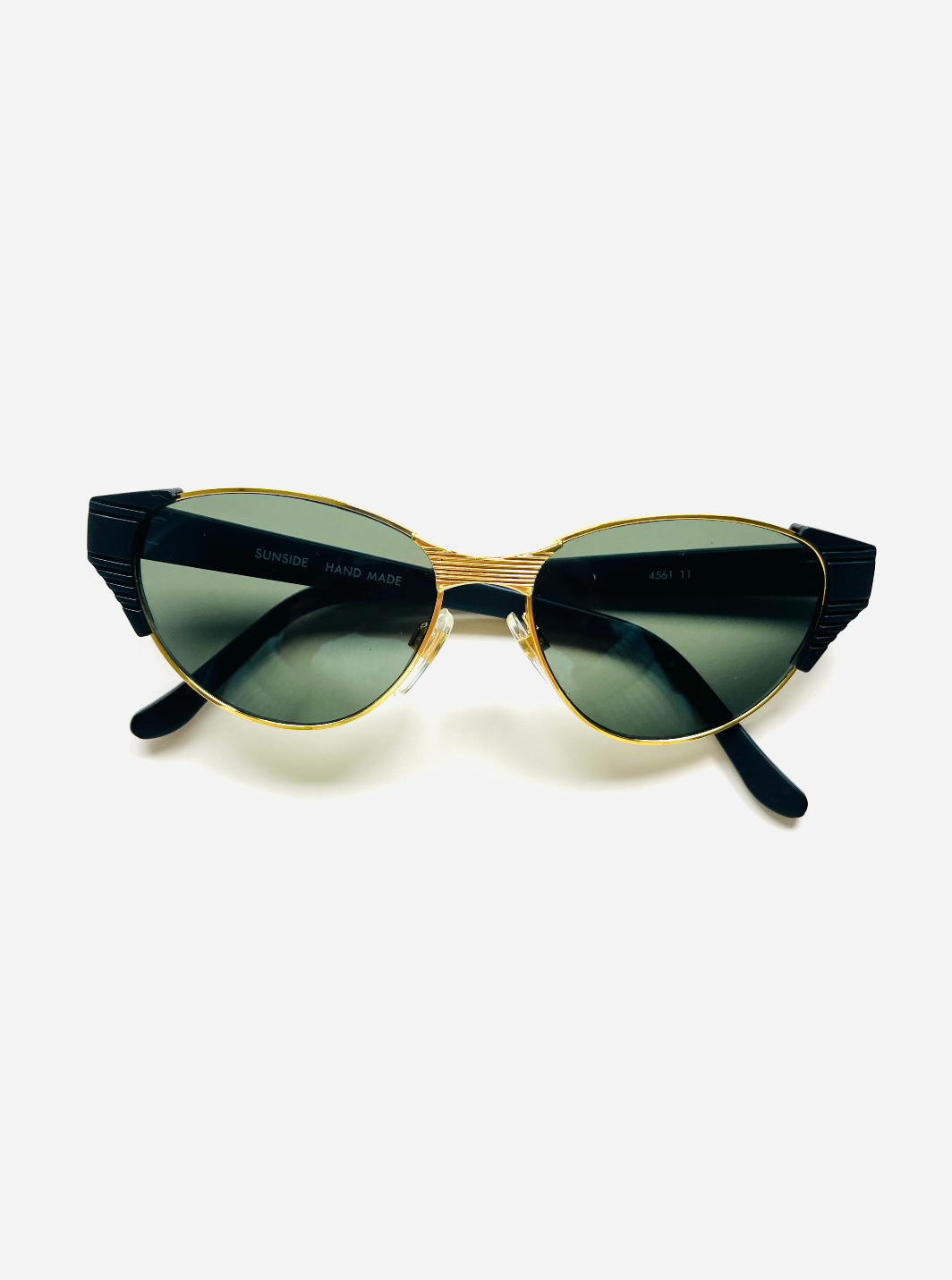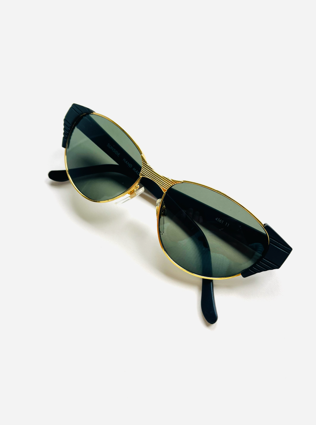 Gafa vintage unisex de primera mano con montura dorada y negra, cristal gris oscuro.