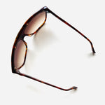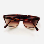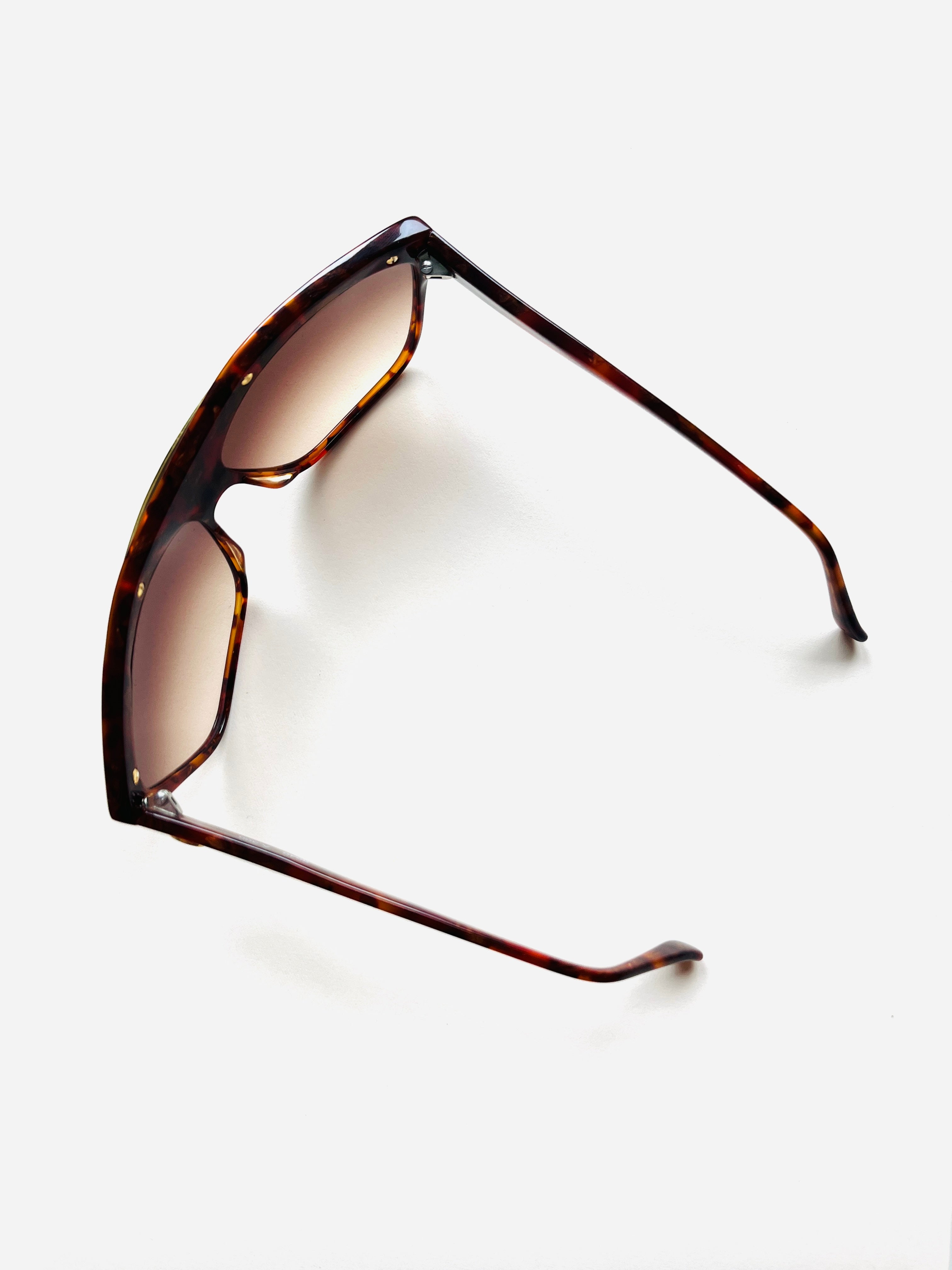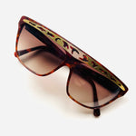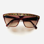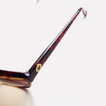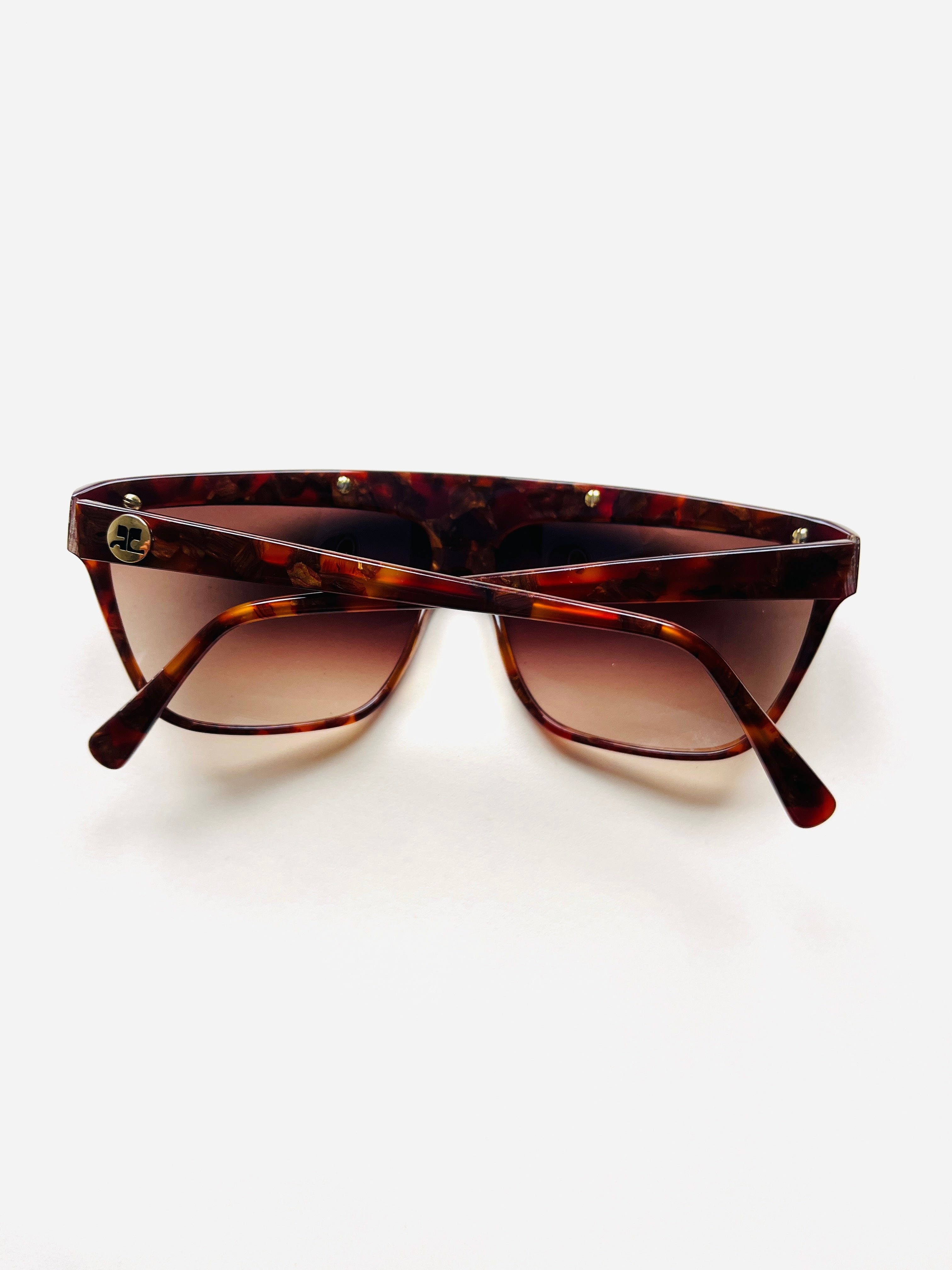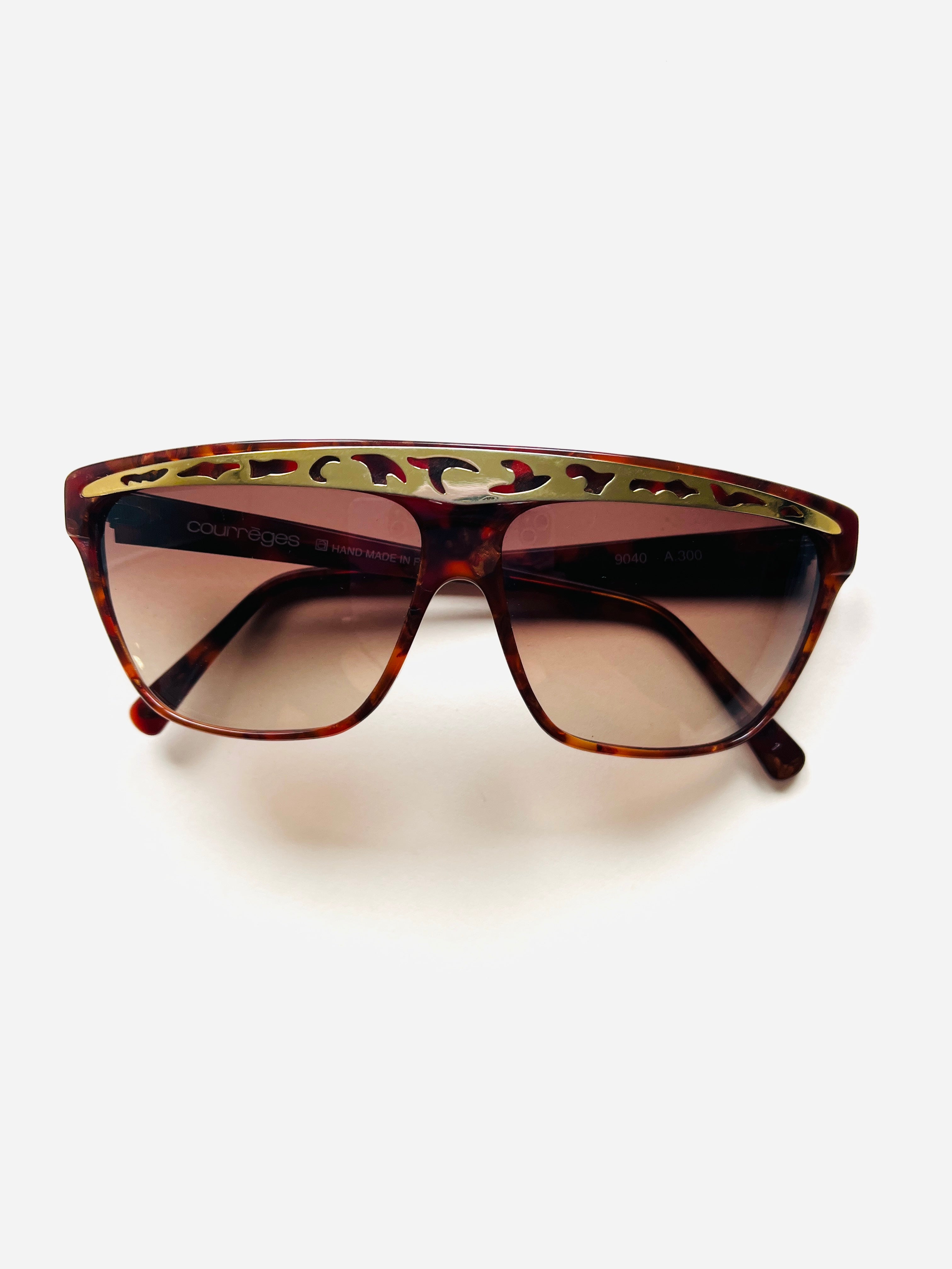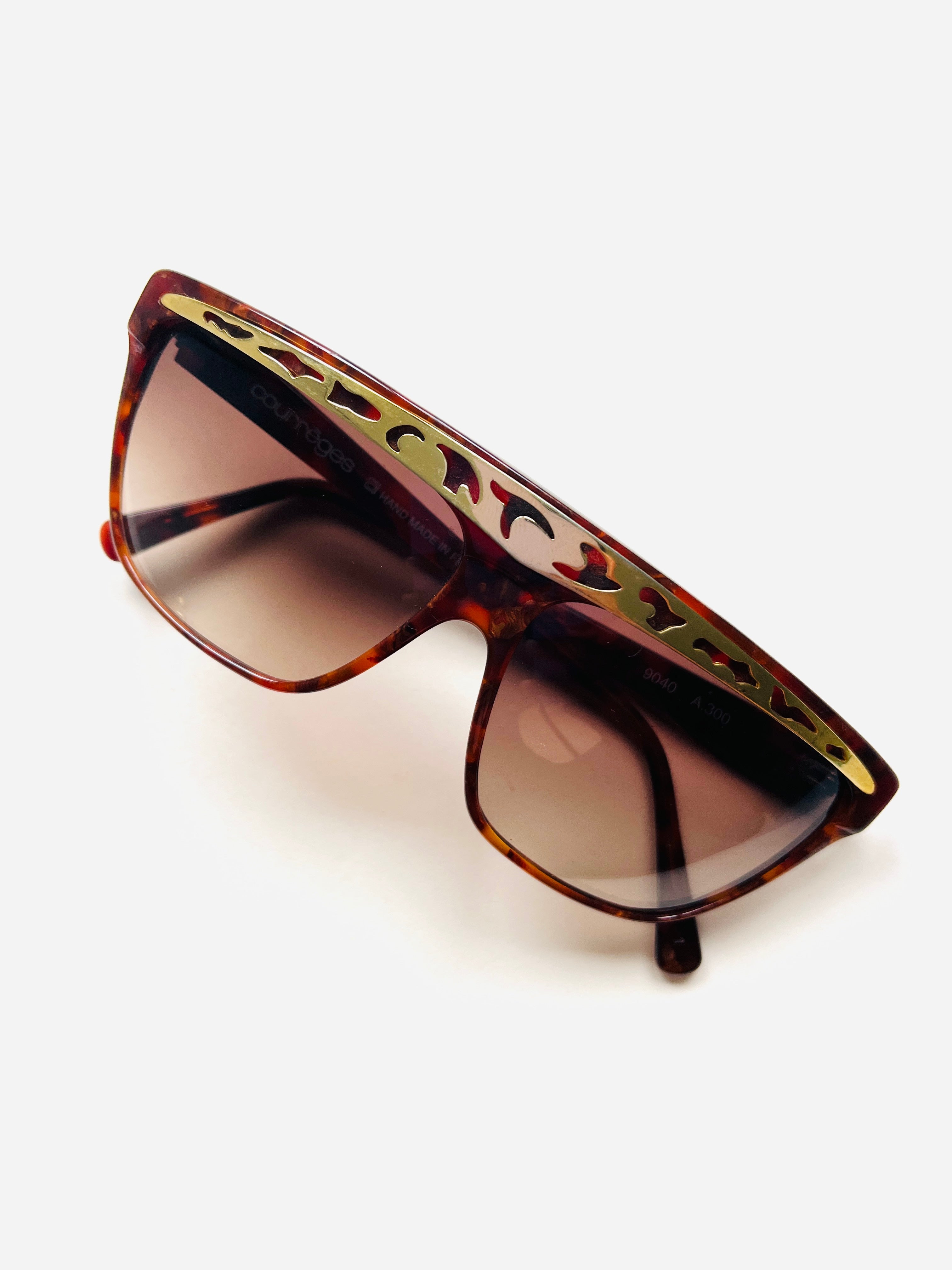 Gafa vintage unisex original de los años 90 de primera mano de la marca Courrèges. Montura en color marrón jaspeado con detalle en dorado troquelado con cristal marrón degradado.