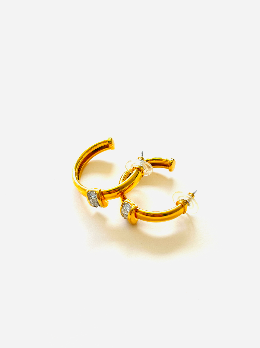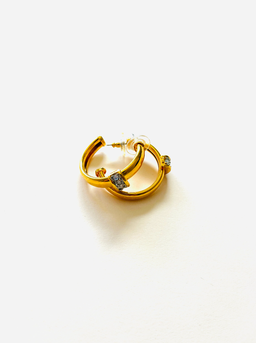 Pendientes vintage originales de los años 90. Base dorada fina en forma de aro circular con cierre de tuerca y apliques en cristal blanco.