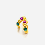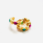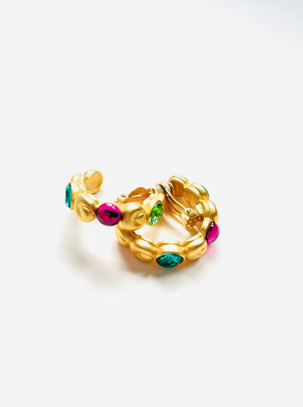 Pendientes vintage originales de los años 90 de la marca Givenchy. Base dorada en forma de aro abierto con detalles de cristal rosa, verde y azul.
