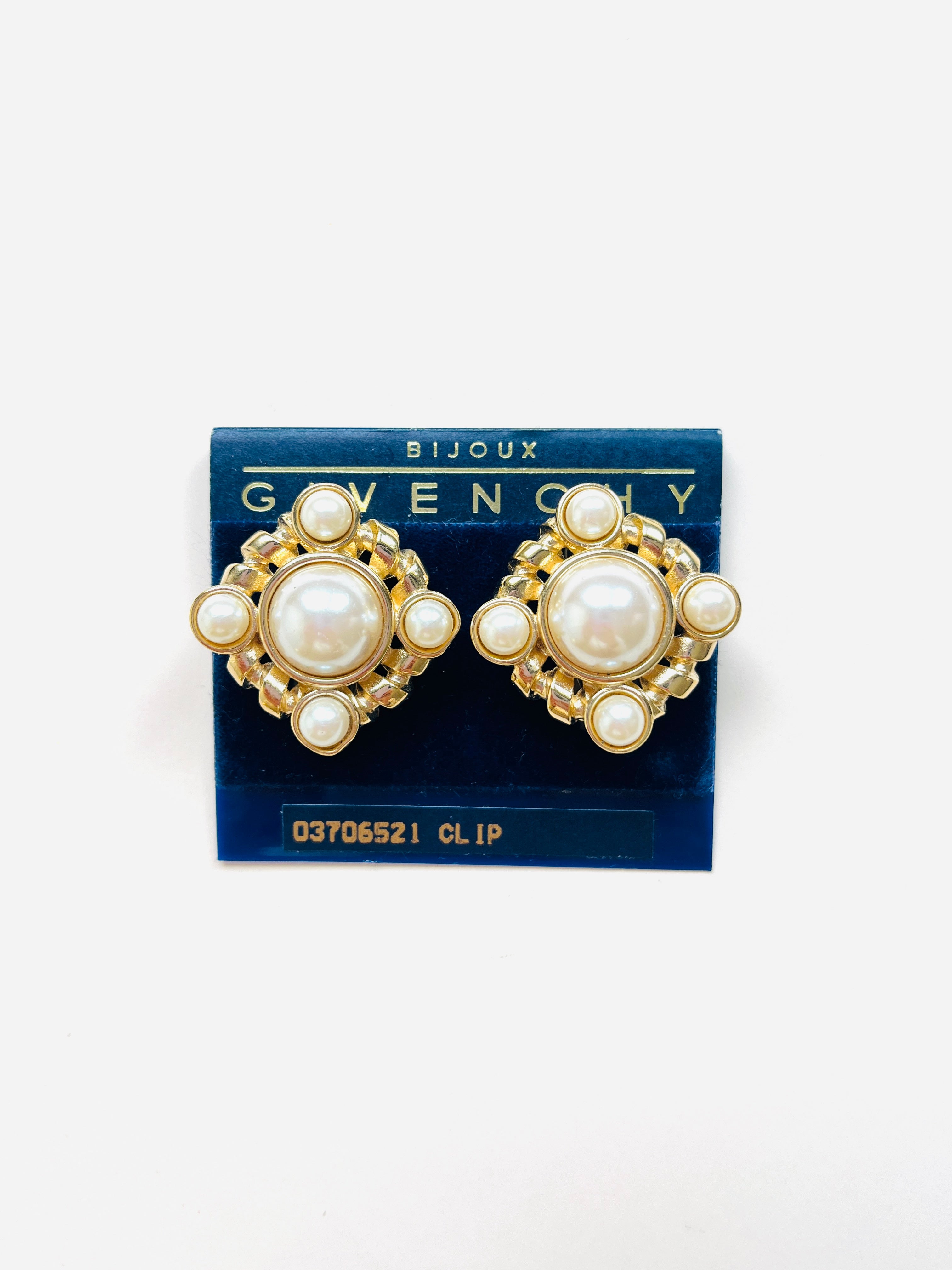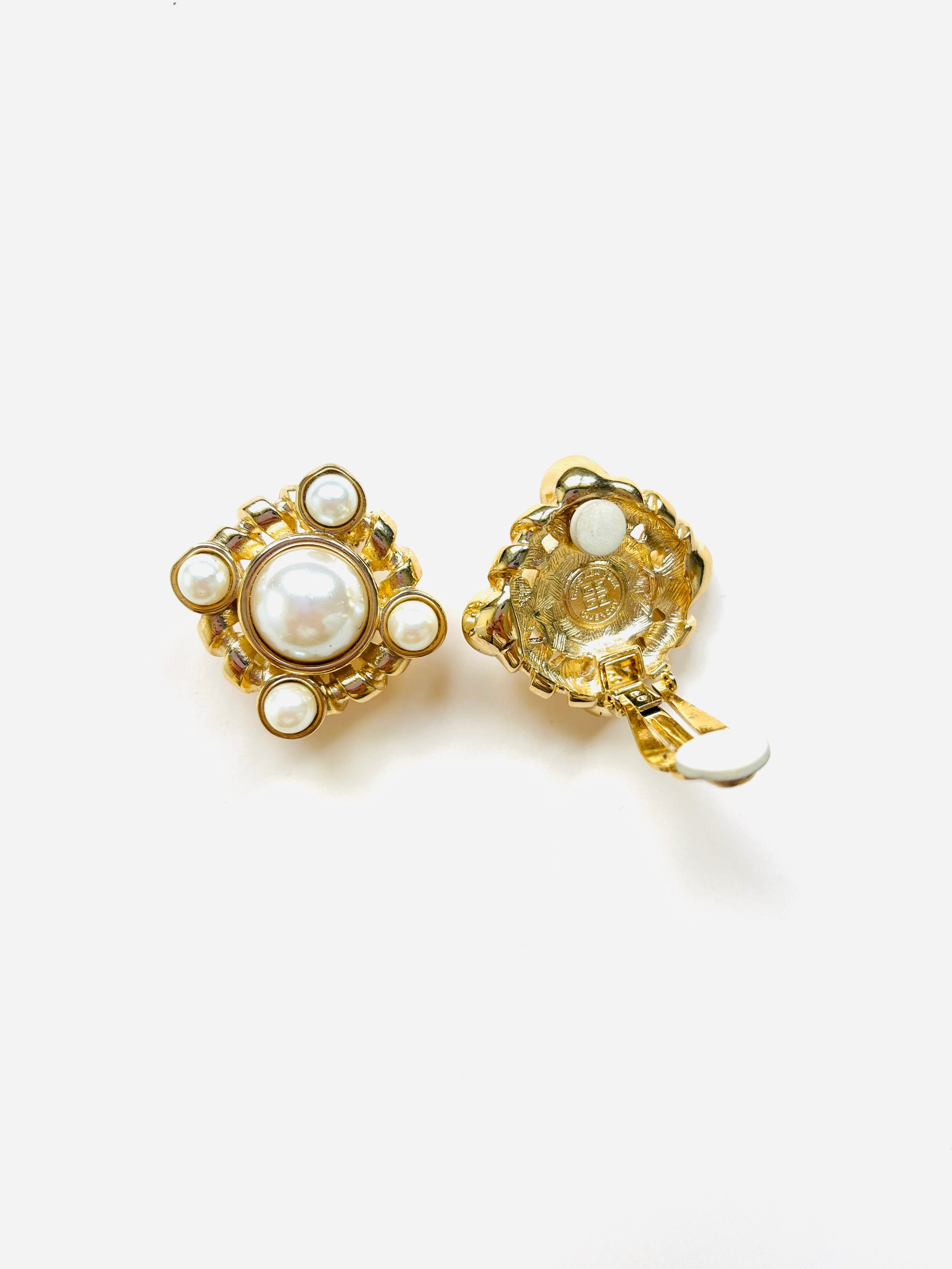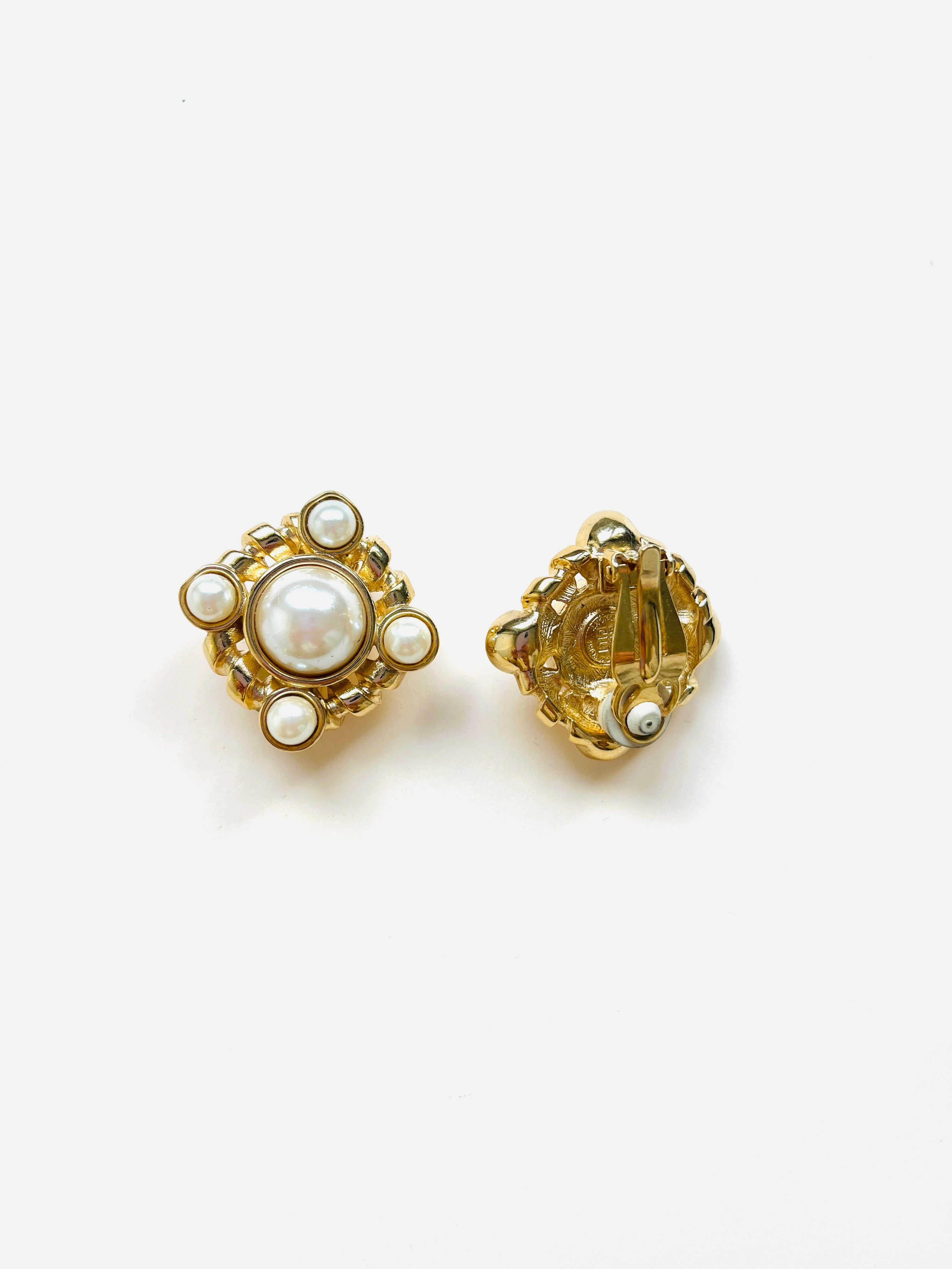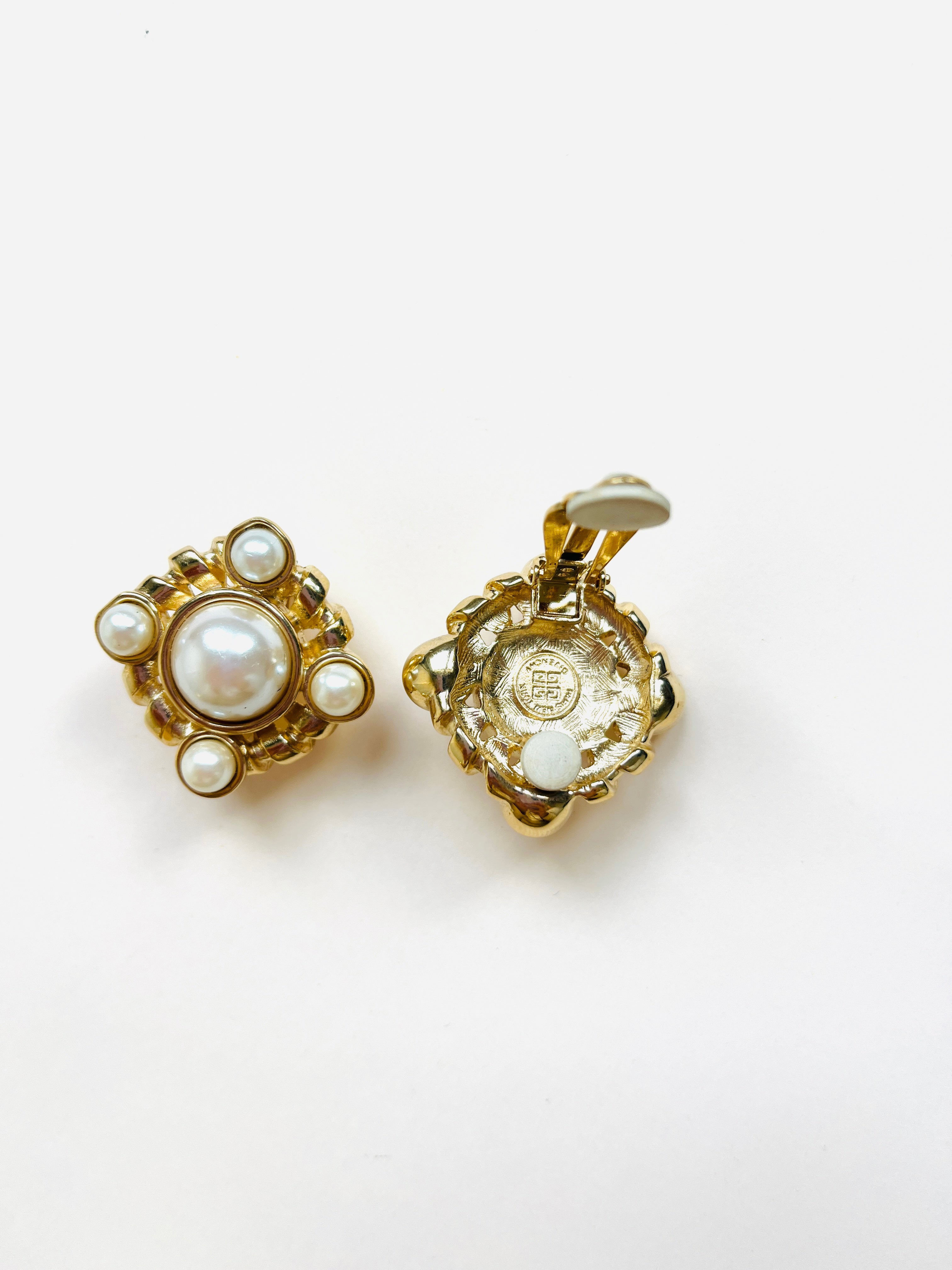 Pendientes vintage originales de los años 90 de la marca Givenchy. Base dorada en forma cuadrada dorada con apliques de perla blanca en varios tamaños.