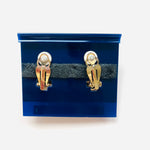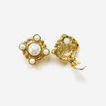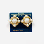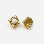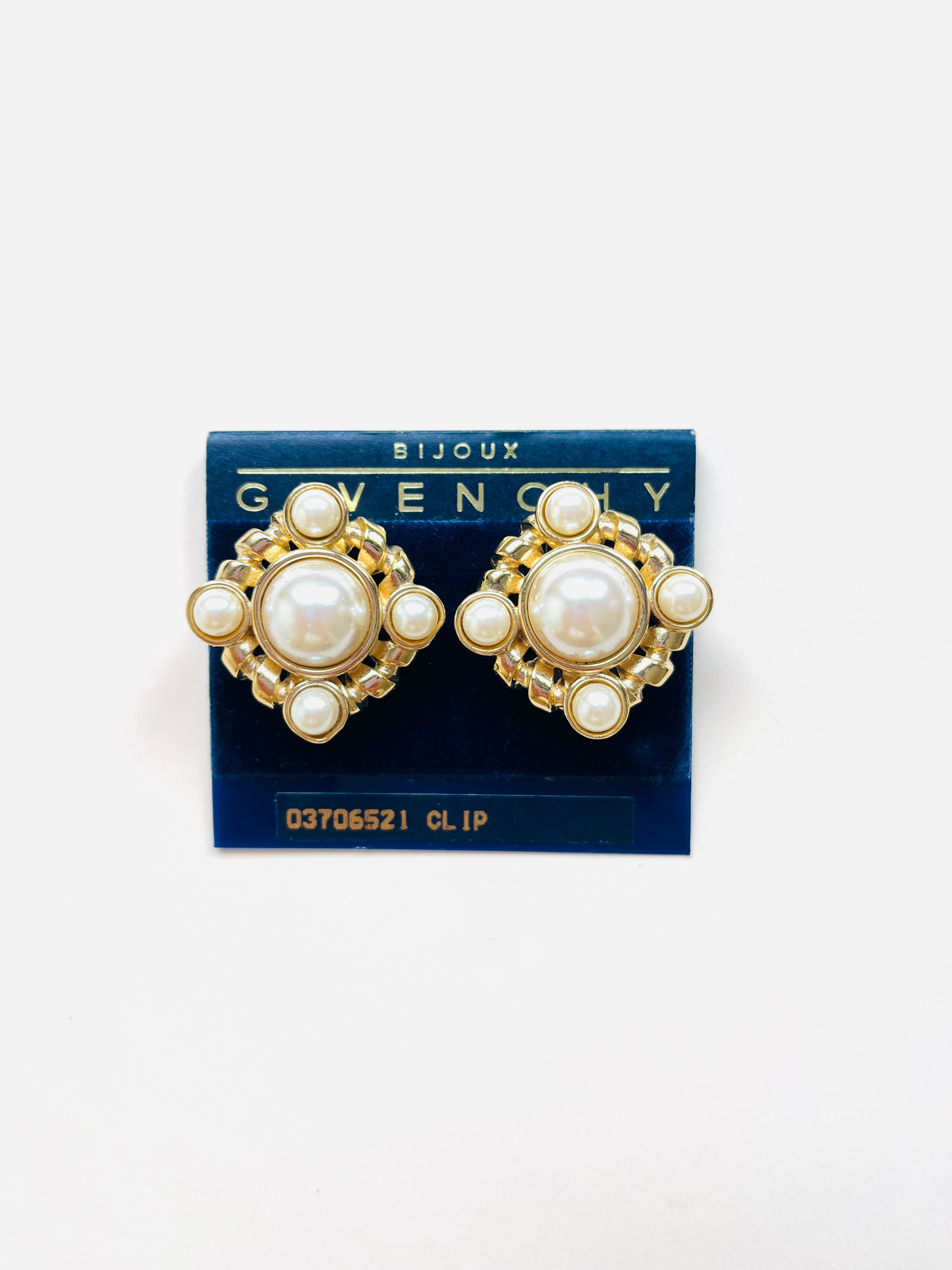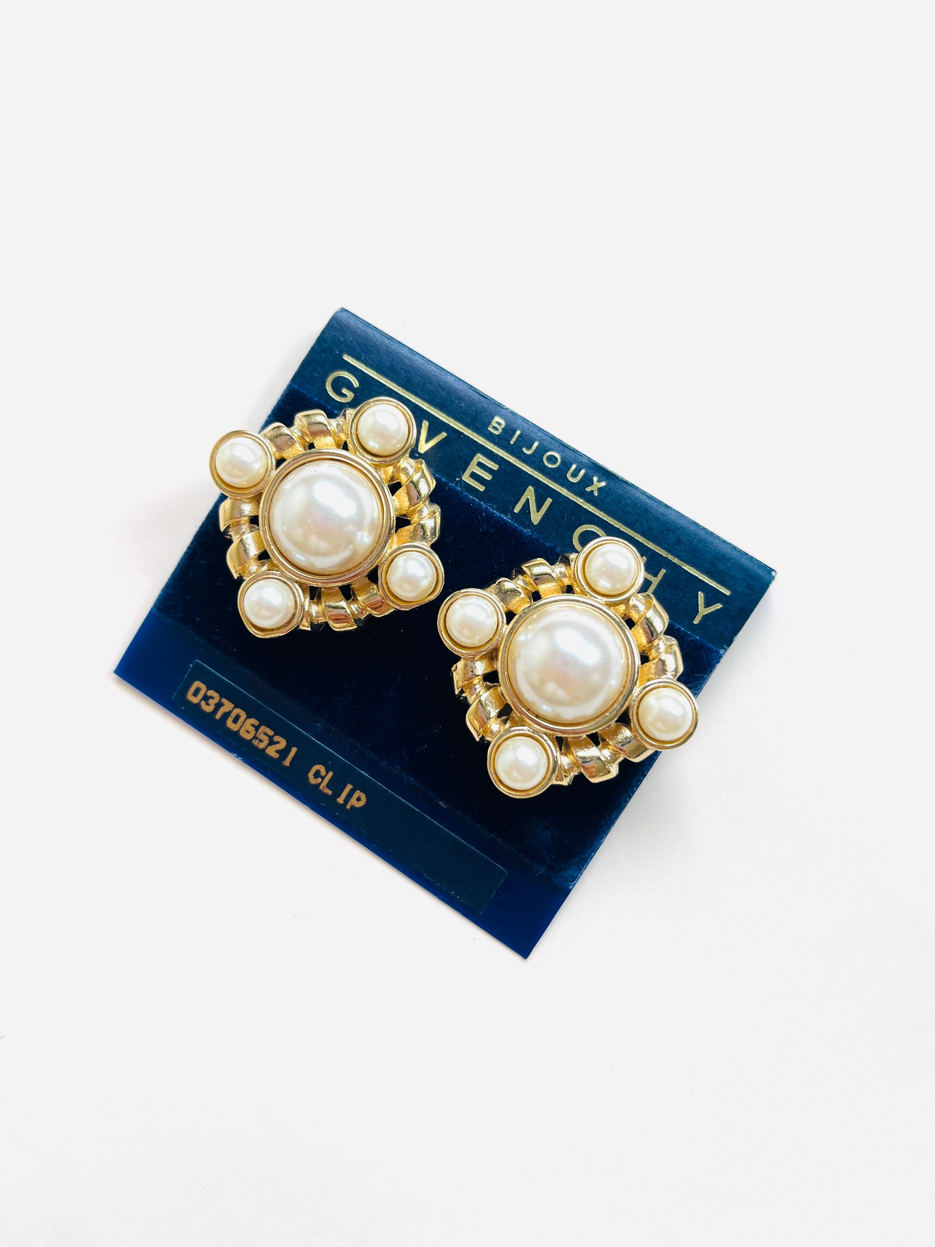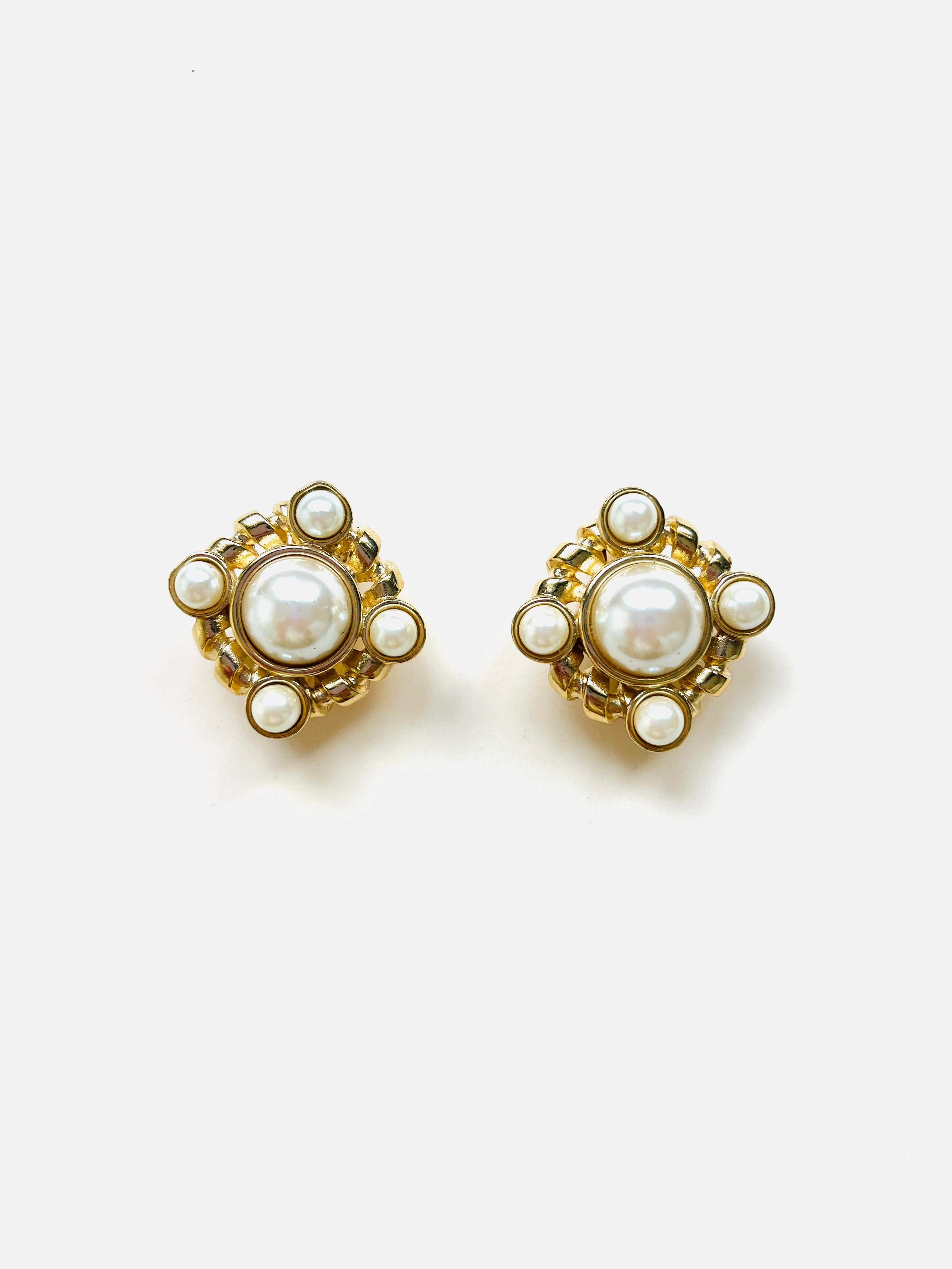 Pendientes vintage originales de los años 90 de la marca Givenchy. Base dorada en forma cuadrada dorada con apliques de perla blanca en varios tamaños.