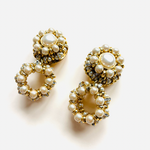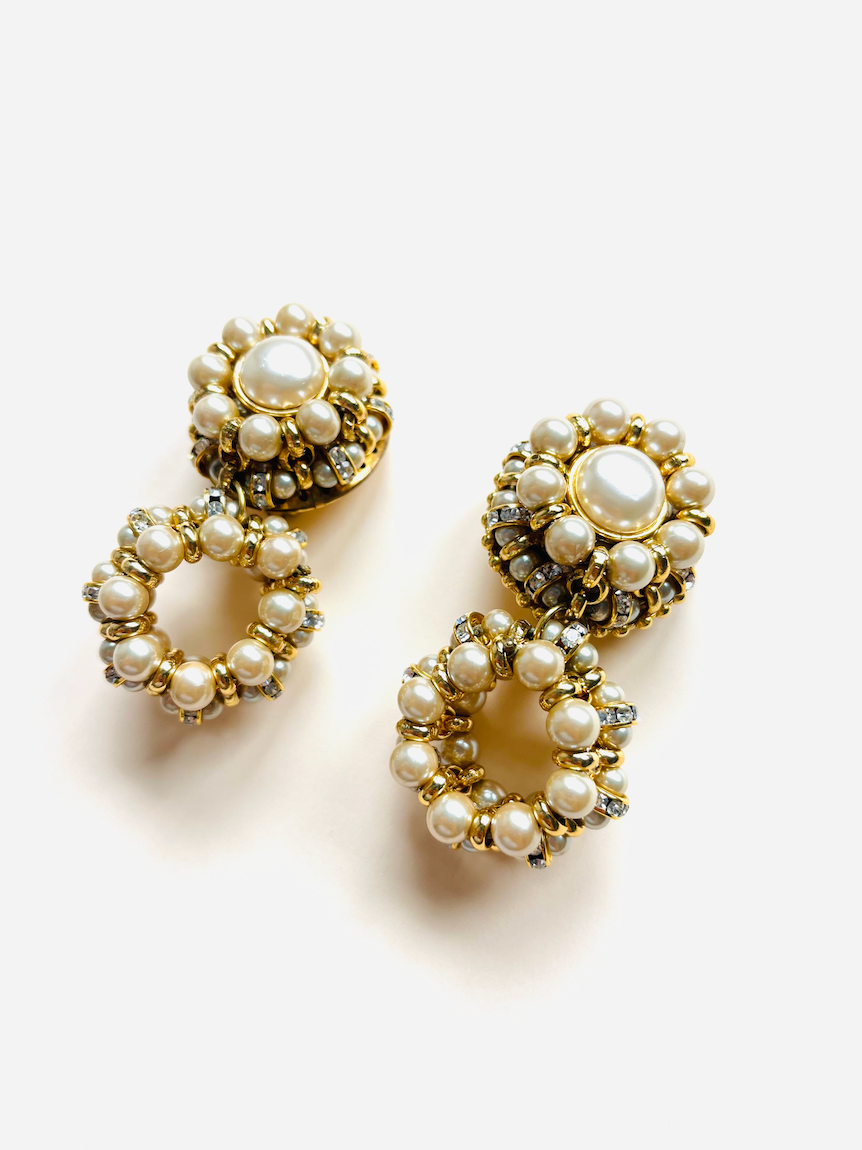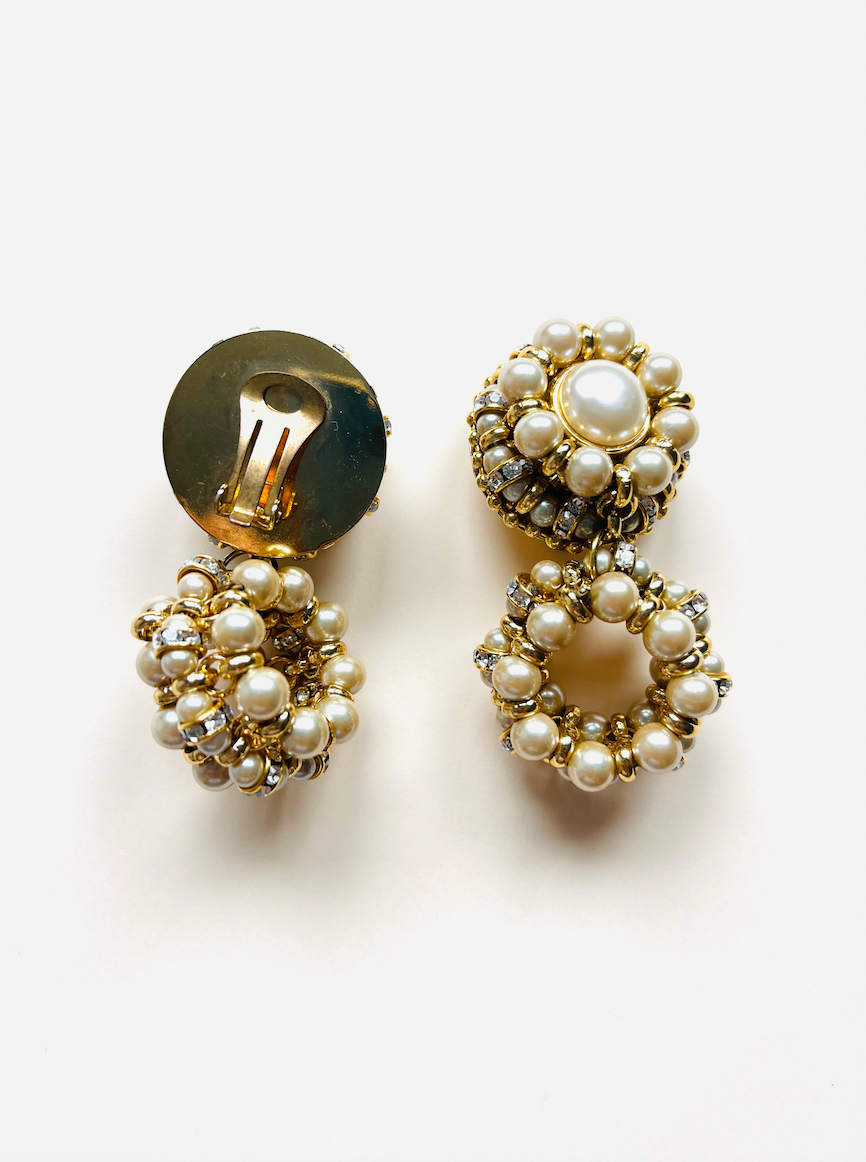 Maxi pendientes vintage originales años 90 con cierre de clip. Base dorada en forma redonda y colgante de perla blanca con apliques en cristal blanco.