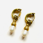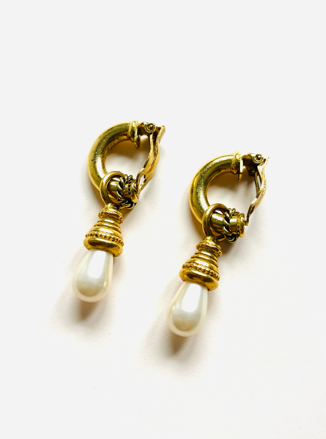 Pendientes vintage originales de los años 90. Base dorada con cierre de clip en forma de aro y detalle de colgante en perla blanca.
