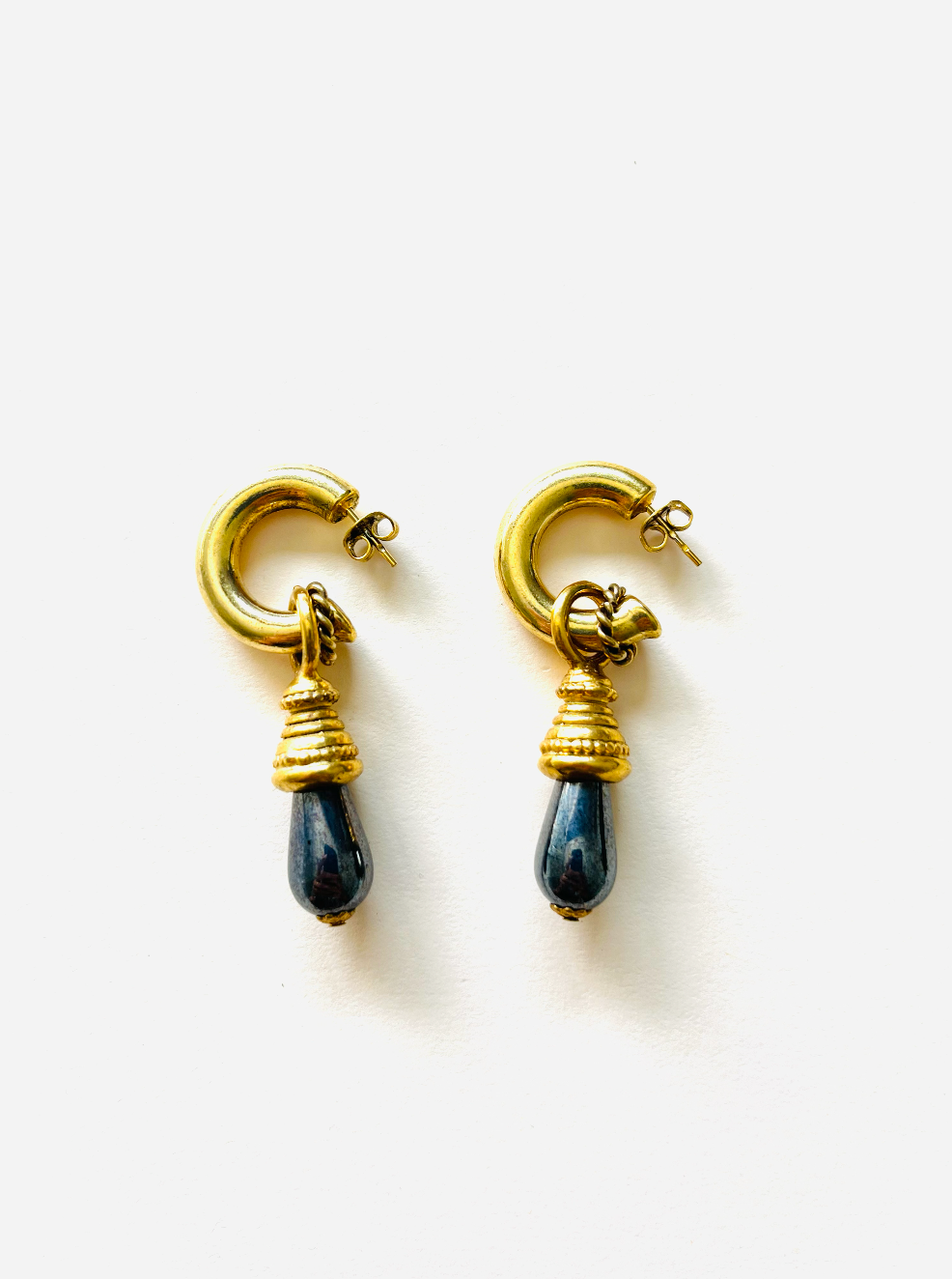 Pendientes vintage originales de los años 90. Base dorada con cierre de tuerca en forma de aro y detalle de colgante gris.
