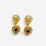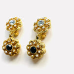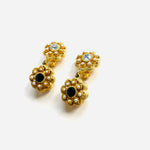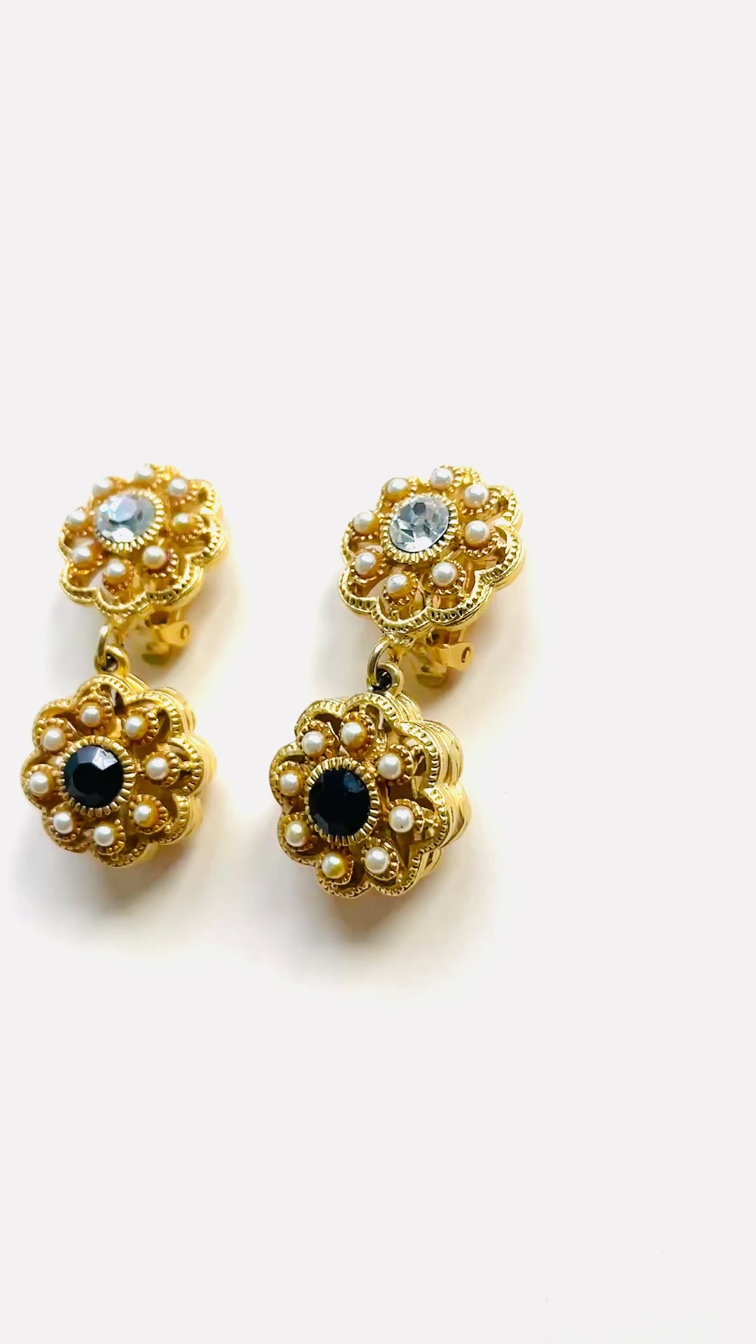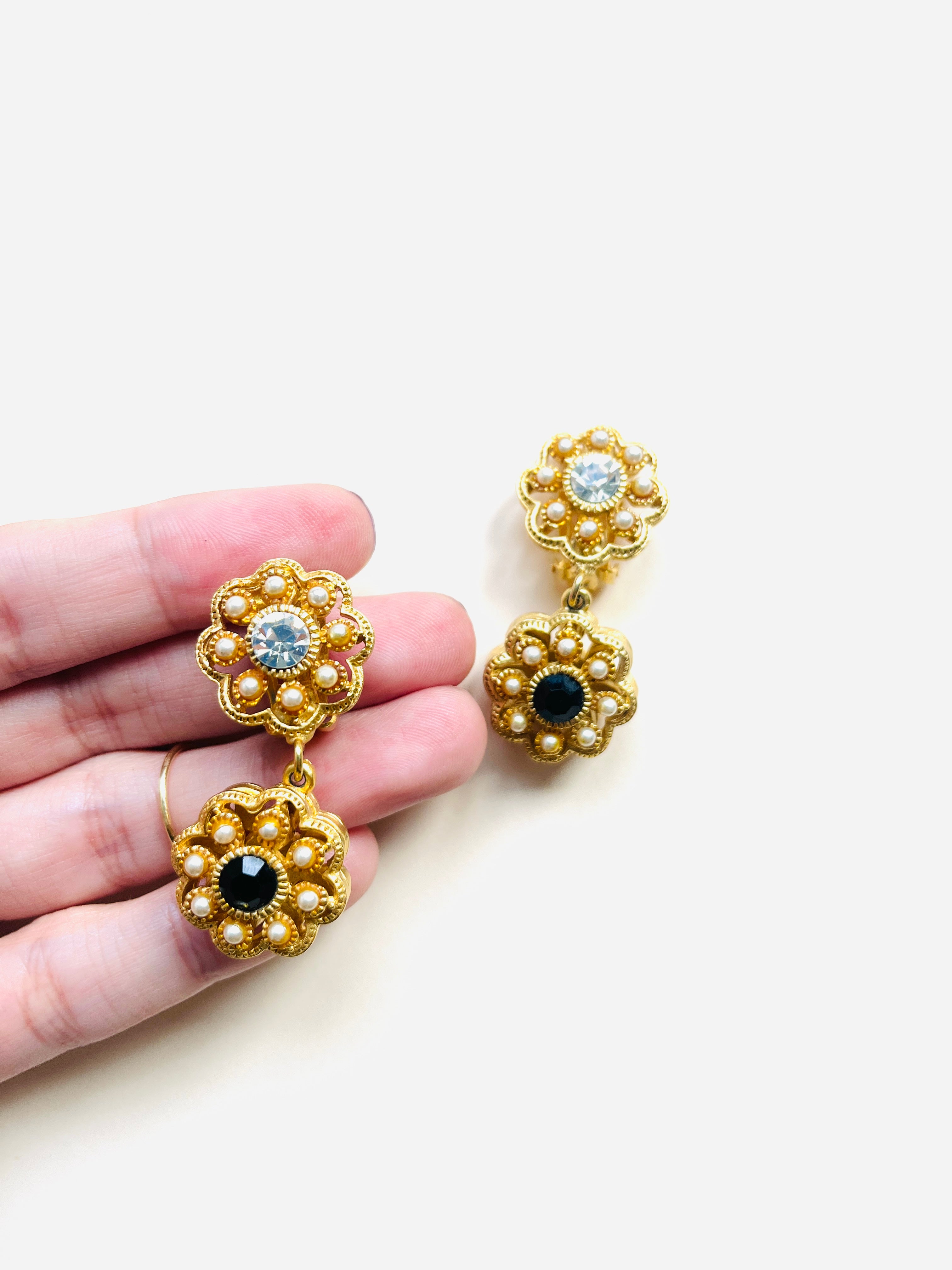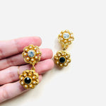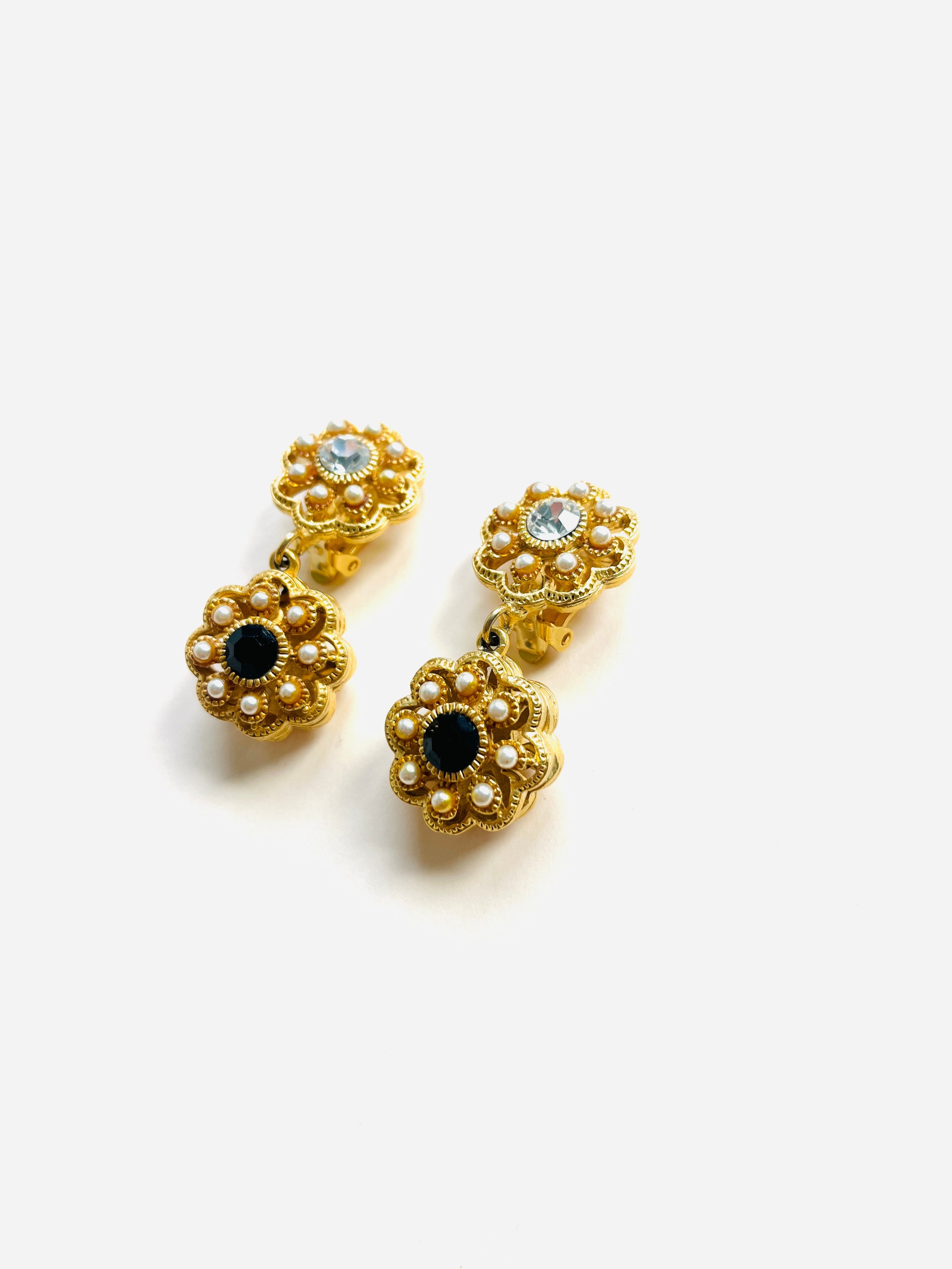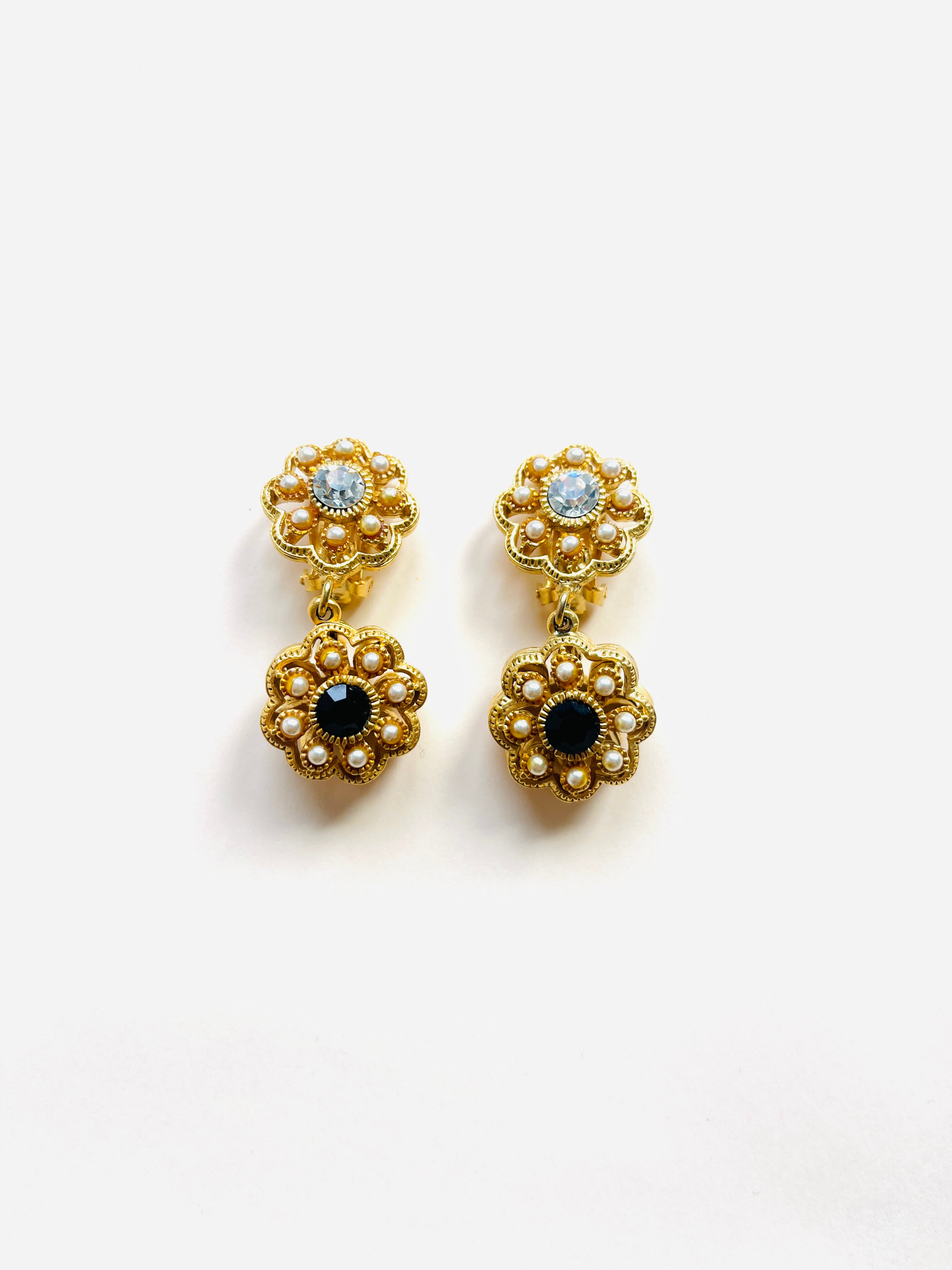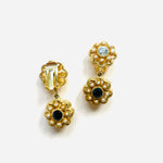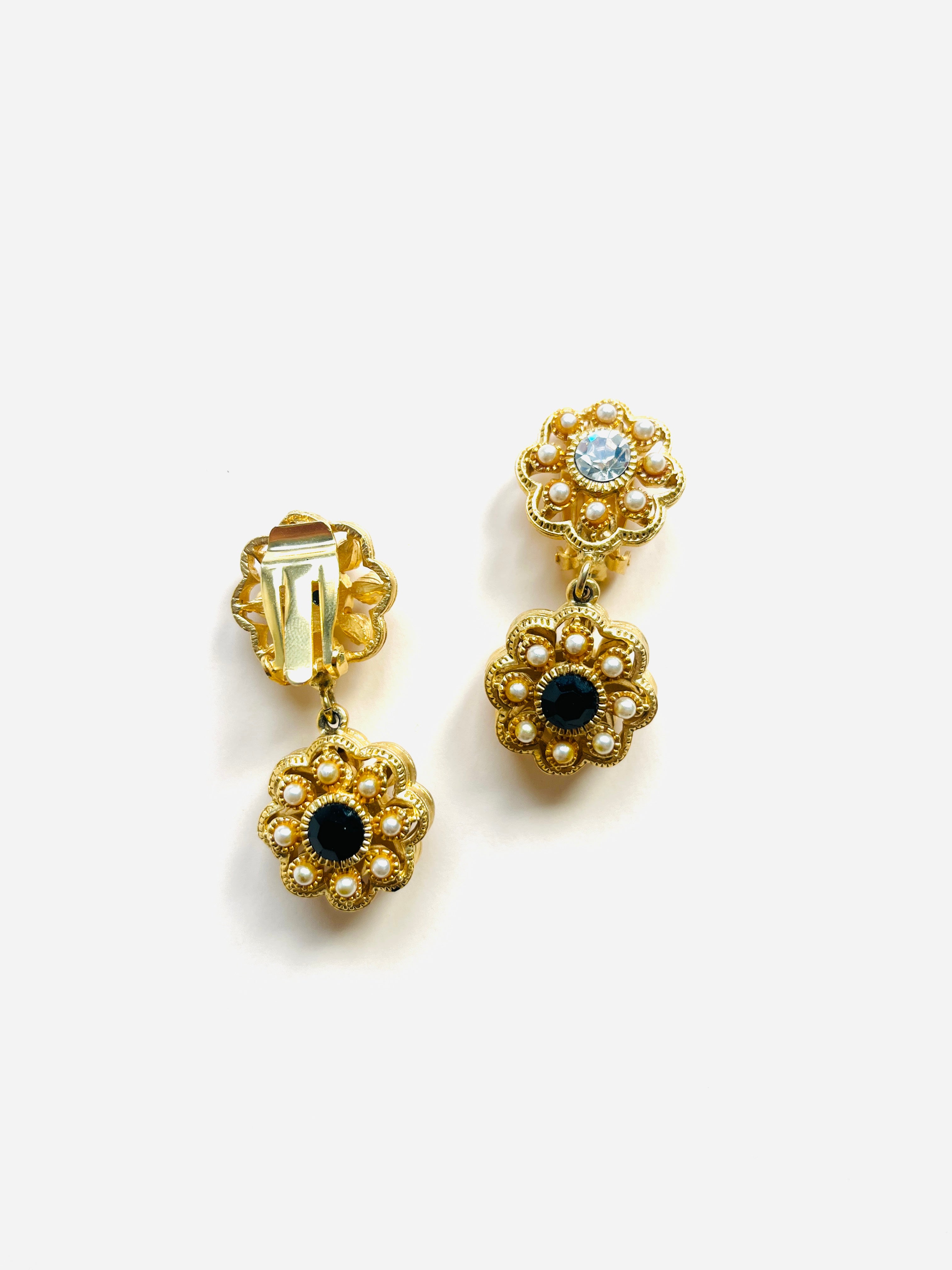 Pendientes vintage originales de los años 90 con cierre de clip. Base dorada y colgante en forma de flor con detalles en cristal blanco y negro, apliques de perla mini.