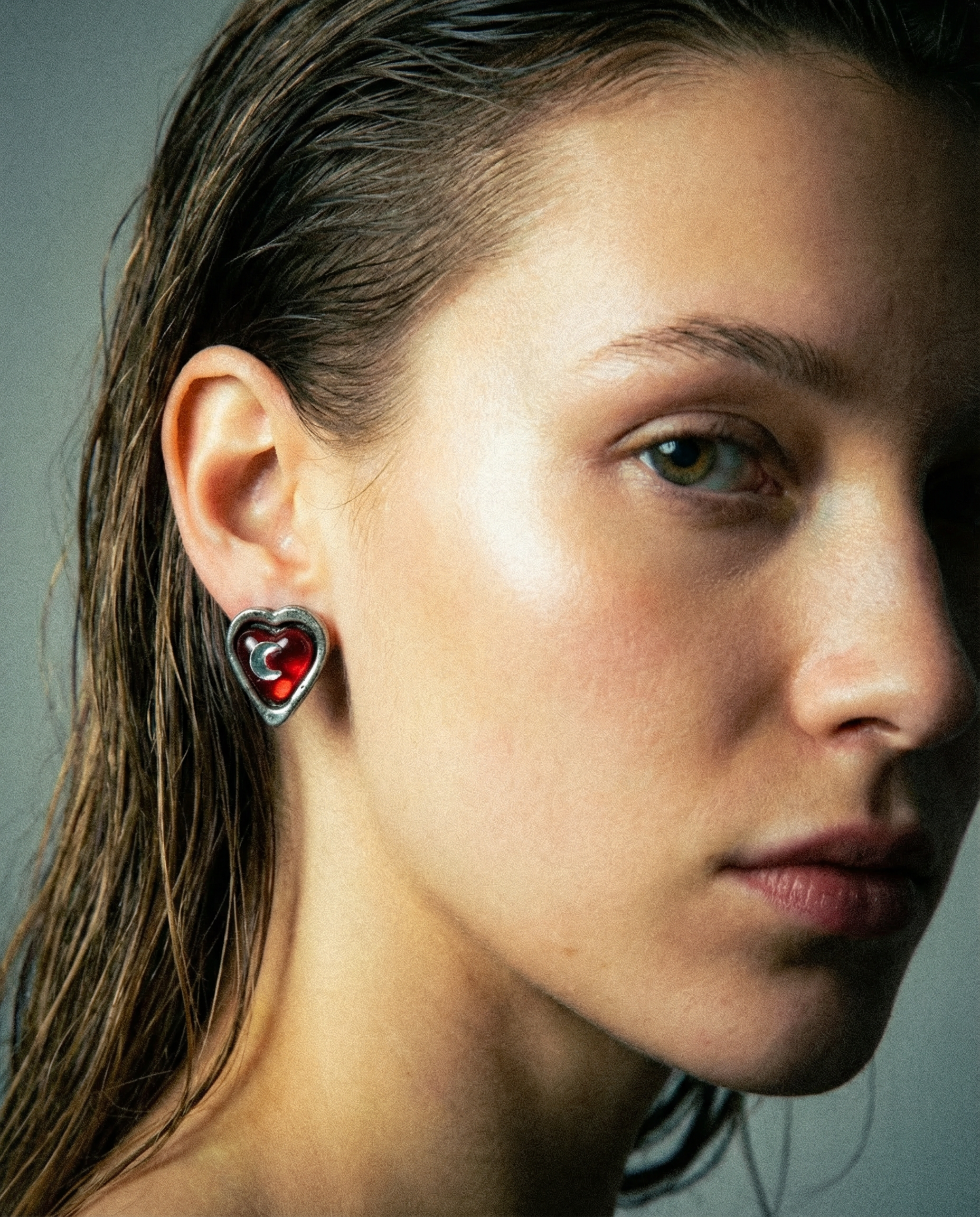 Pendientes vintage originales de los años 90. Base plata con cierre de clip y resina rojo con aplique de cristal blanco en forma de luna.