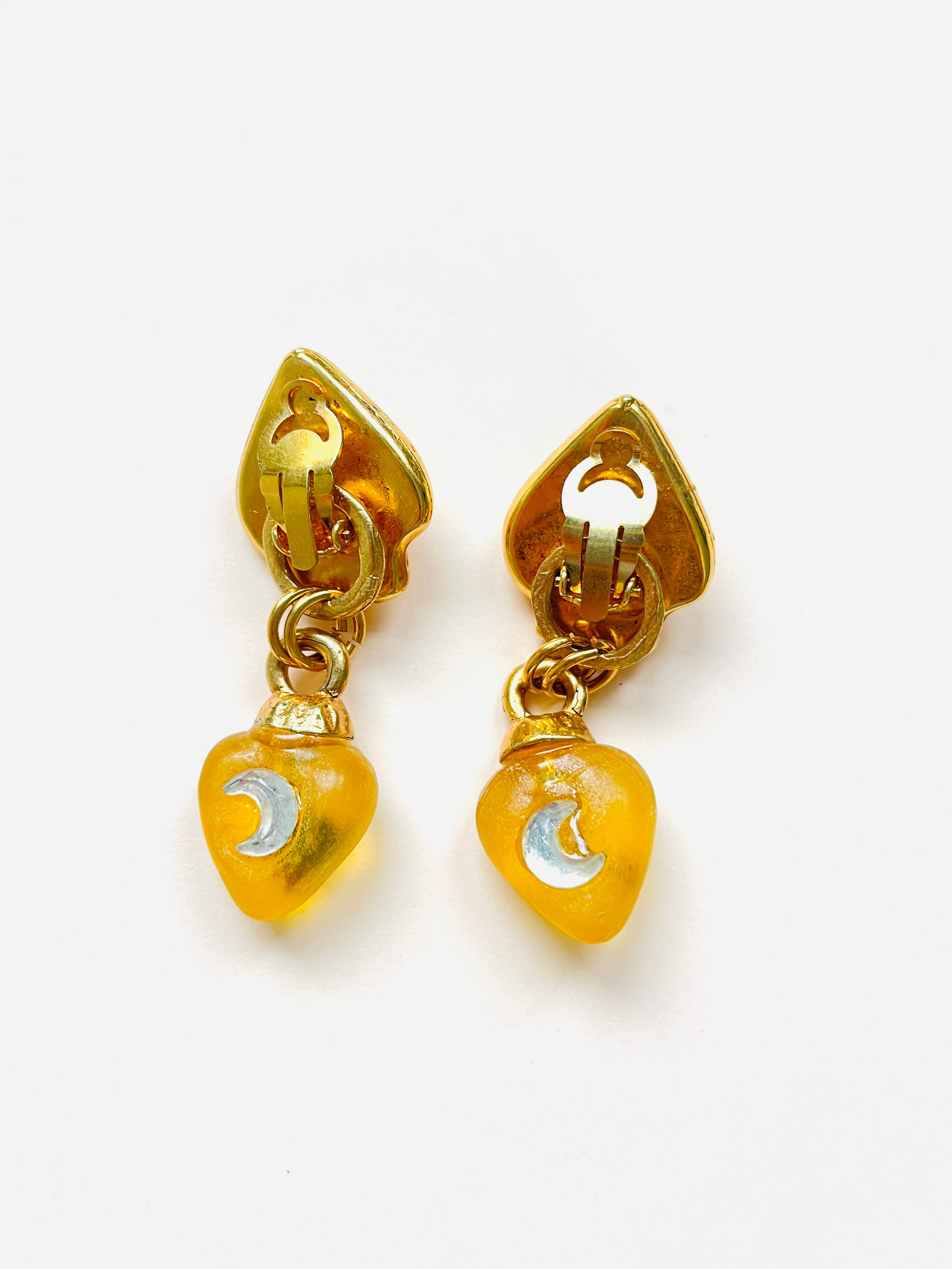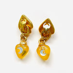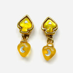 Pendientes vintage originales de los años 90. Base dorada con cierre de clip y resina en amarillo con apliques de cristal blanco en forma de luna y corazón. Pendiente dos en uno, se desmonta el colgante para utilizar solo la base.