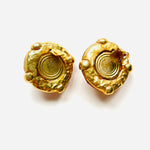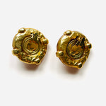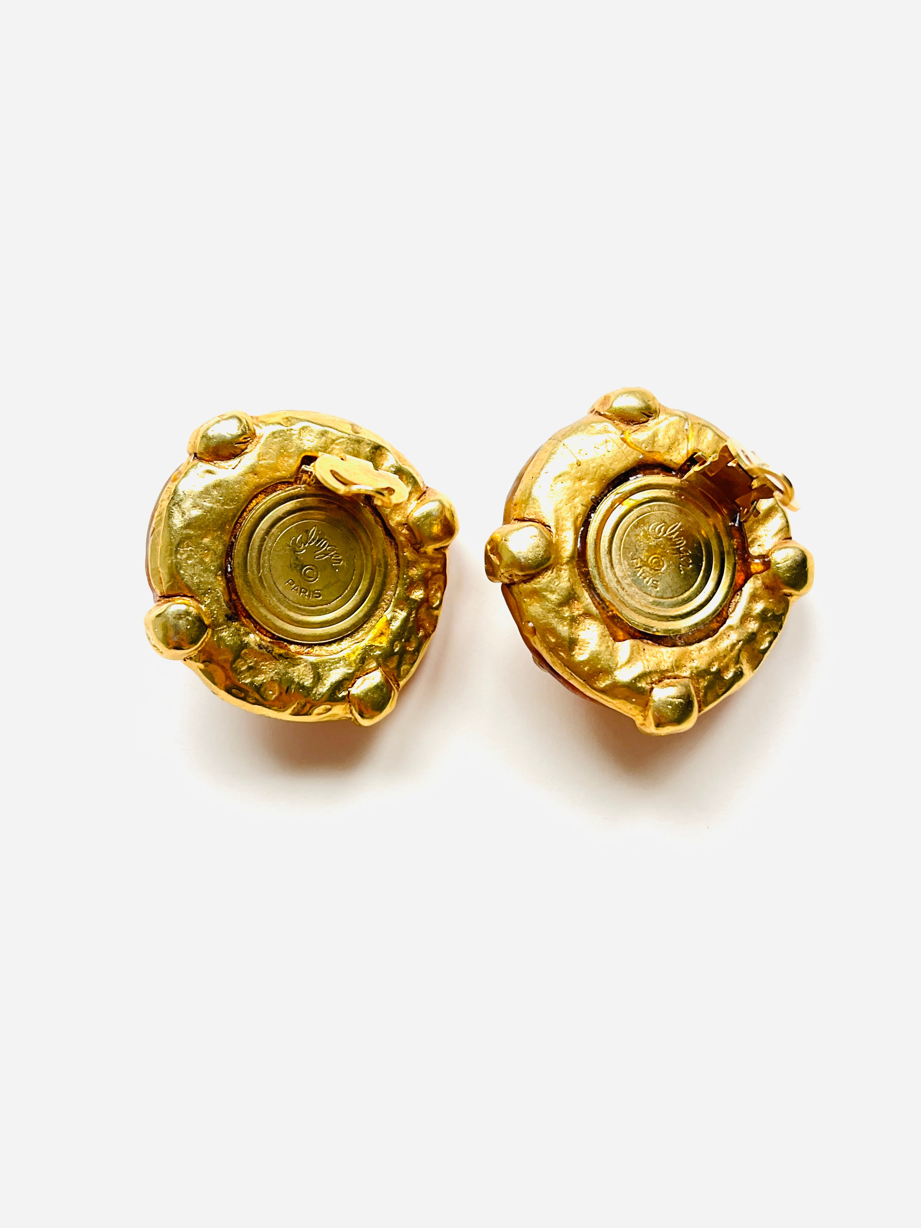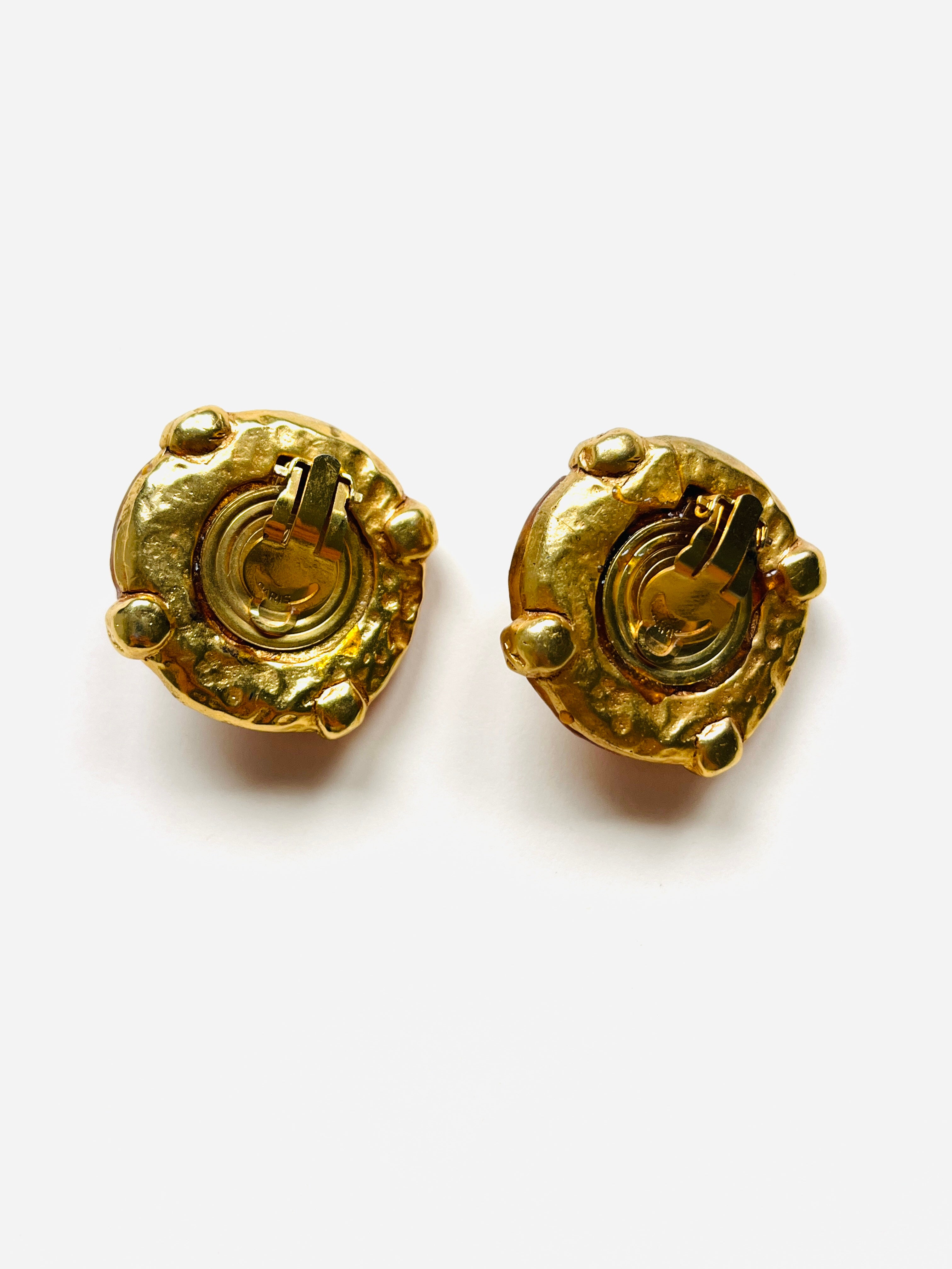 Pendientes con cierre de clip originales de los años 90. Base redonda dorada de material poroso característico de la marca, con resina naranja y apliques en cristal blanco y cristal central rojo.