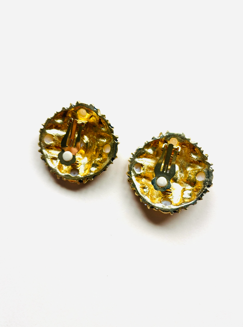 Maxi pendiente vintage con base redonda, cristales blancos y aplicaciones de perla blanca.