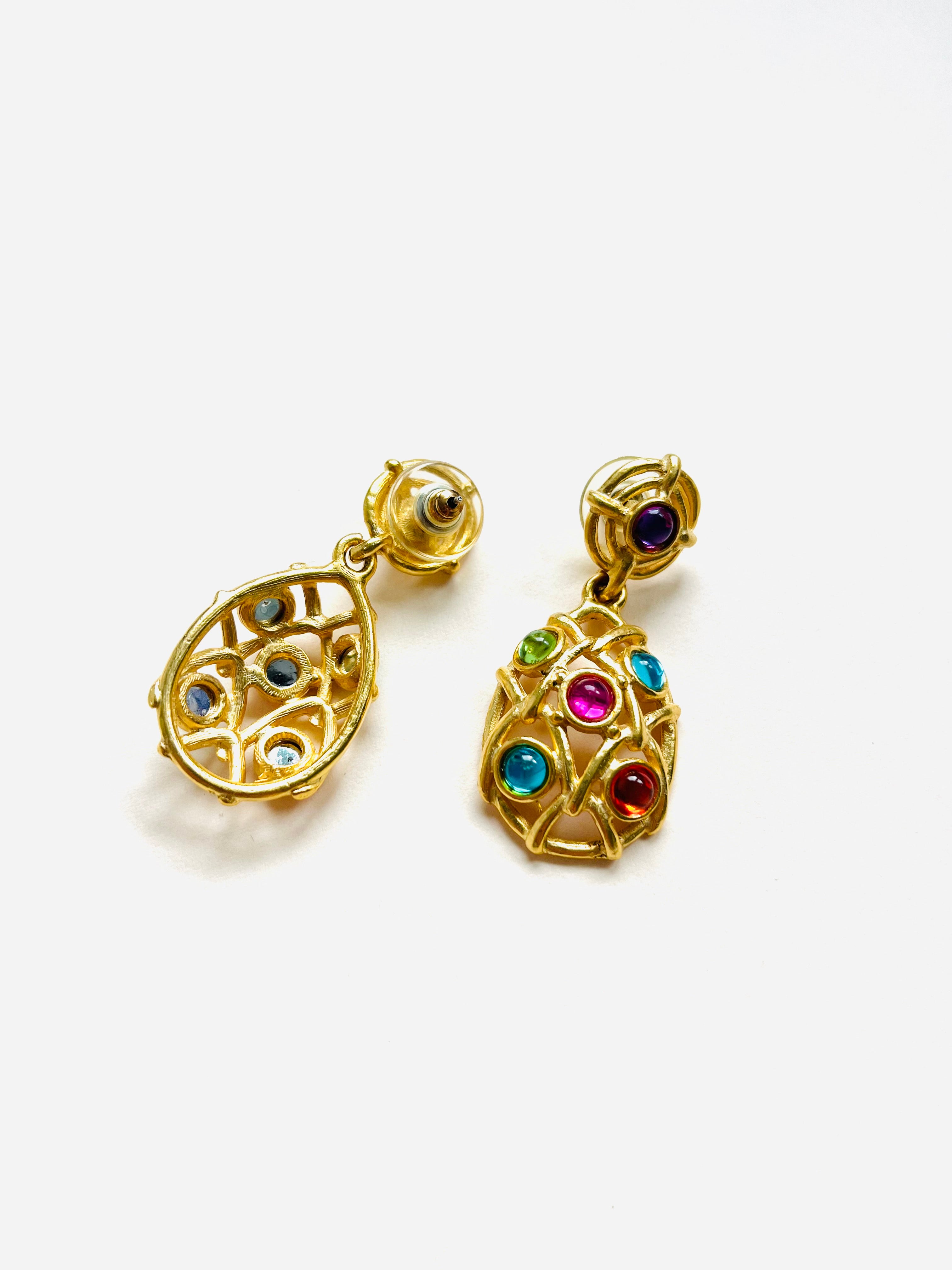 Pendientes vintage originales de los años 90 de la marca Givenchy. Base dorada abierta con detalles de apliques de cristal rosa, morado, verde, naranja y azul.