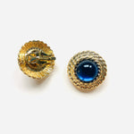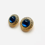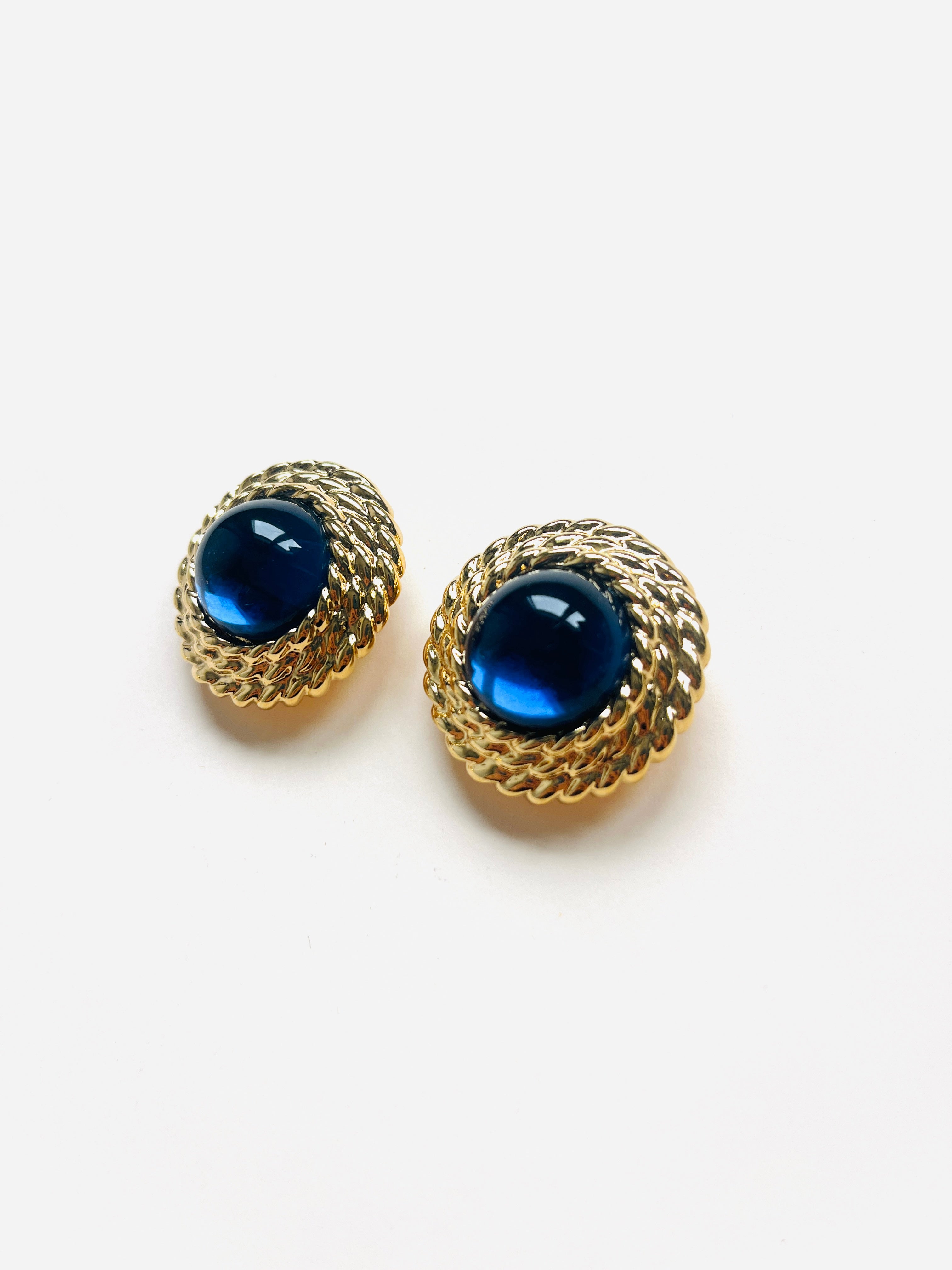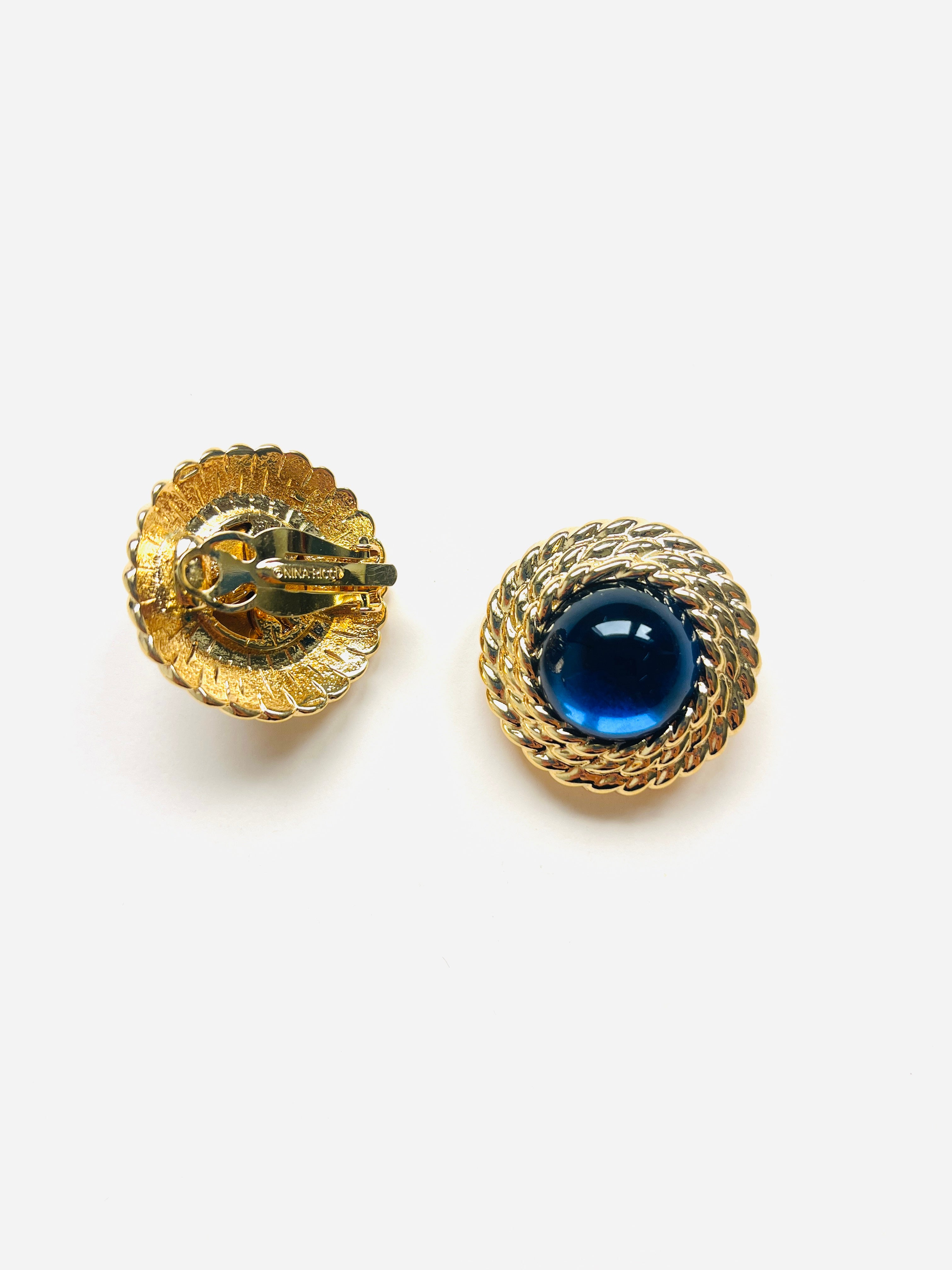 Pendientes vintage originales de la marca Nina Ricci años 90. Base dorada redonda con cristal central maxi en color azul con cierre de clip. Incluye paño de limpieza original de la marca Nina Ricci en color blanco y letras en dorado.