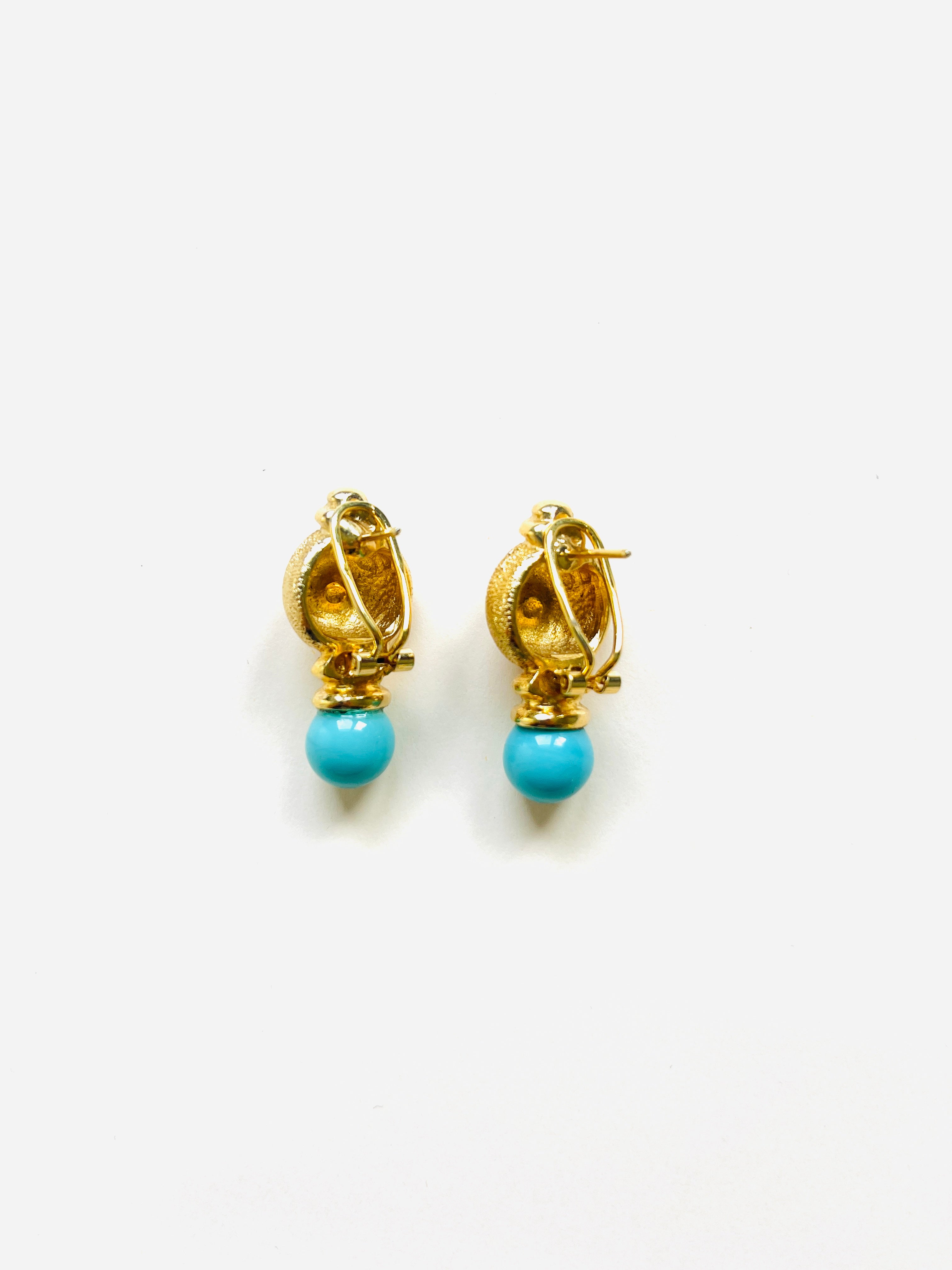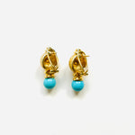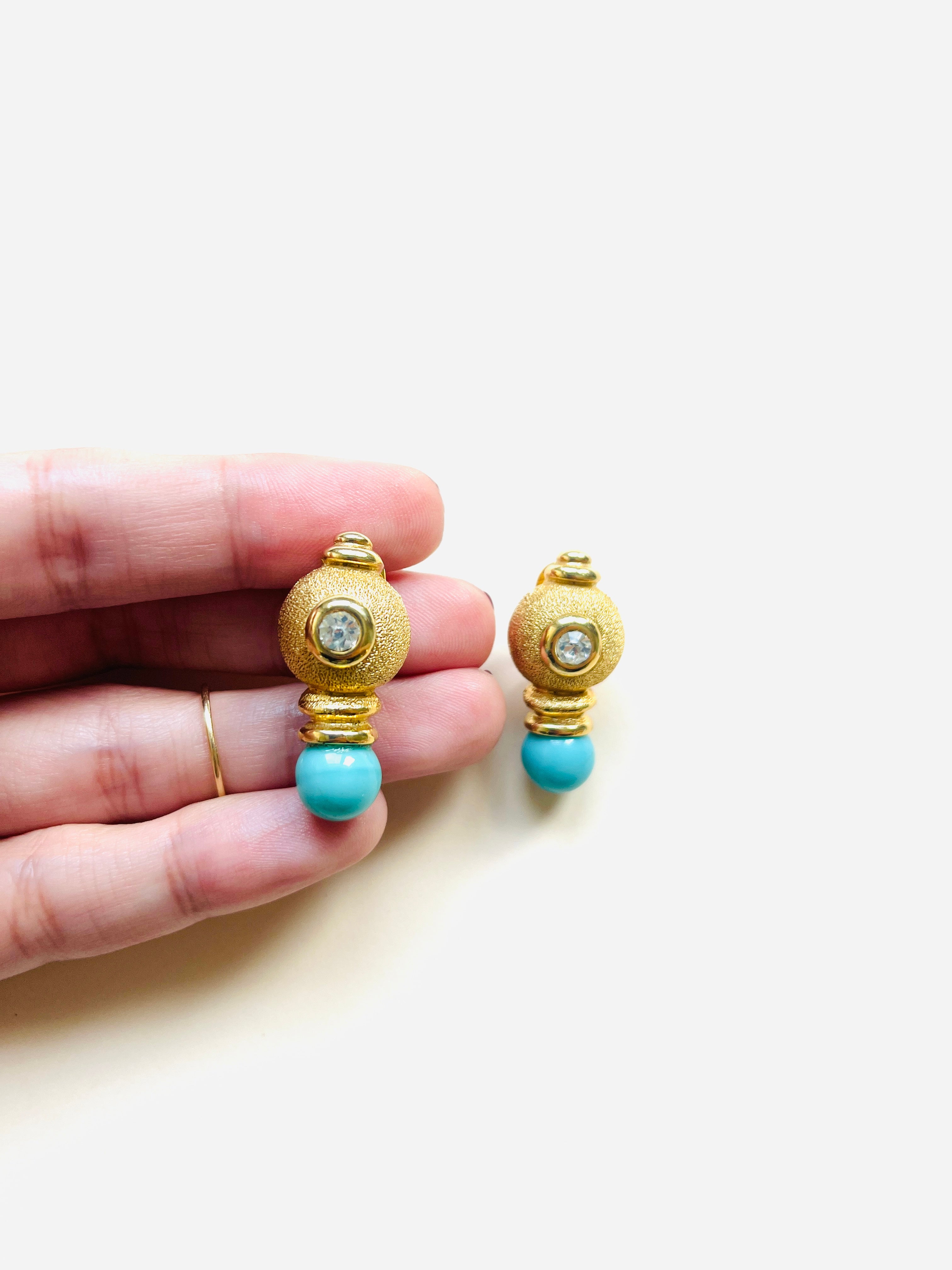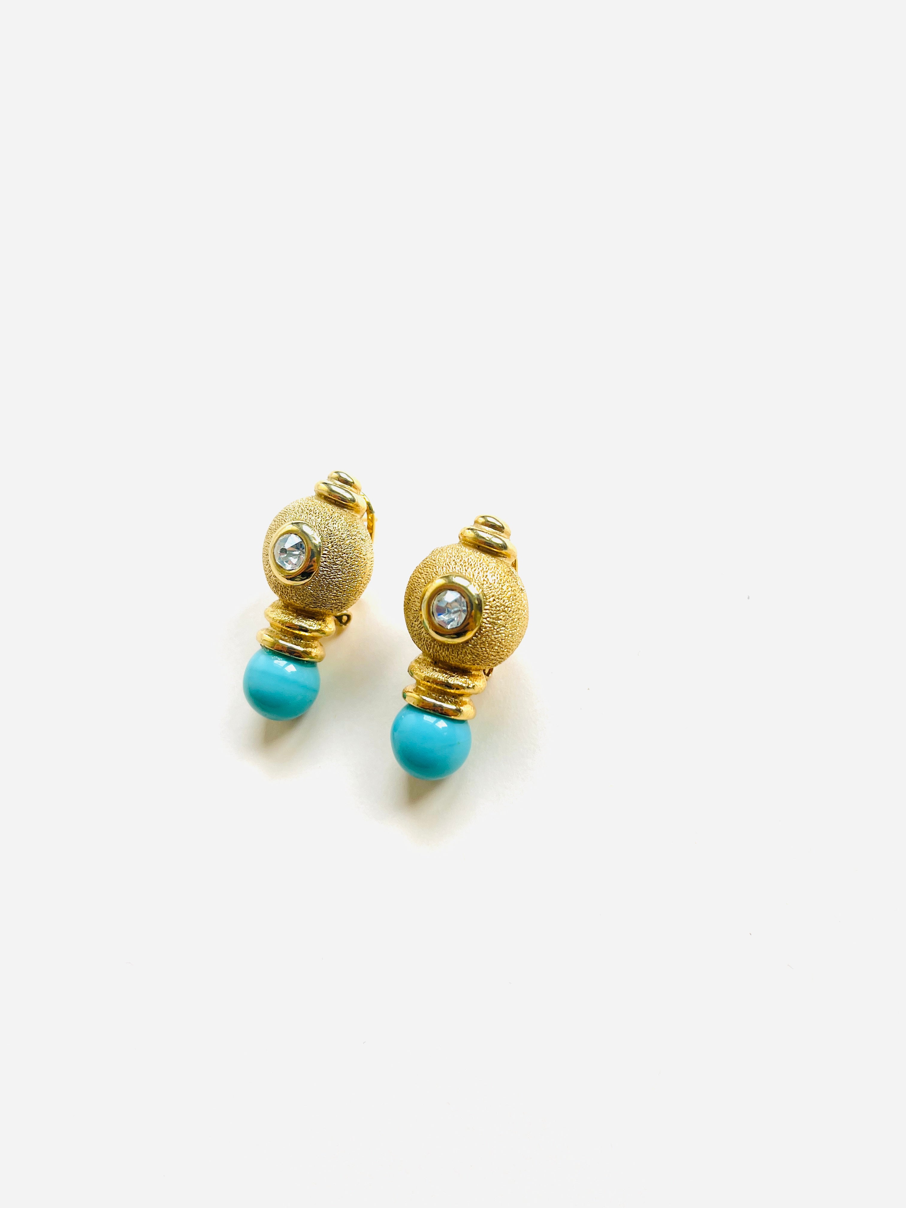 Pendientes vintage originales de los años 90 con cierre omega. Base dorada redonda en dorado, detalle en abalorio azul turquesa y aplique en cristal blanco.