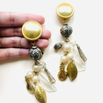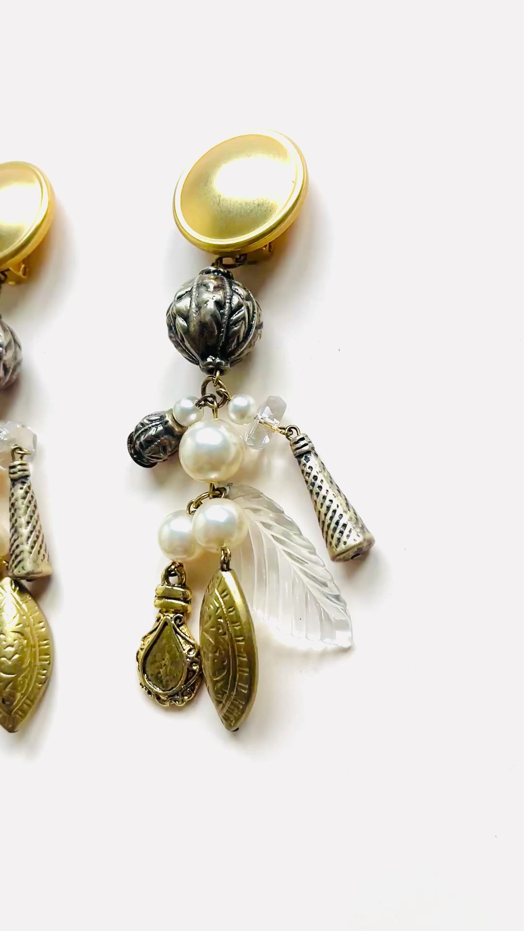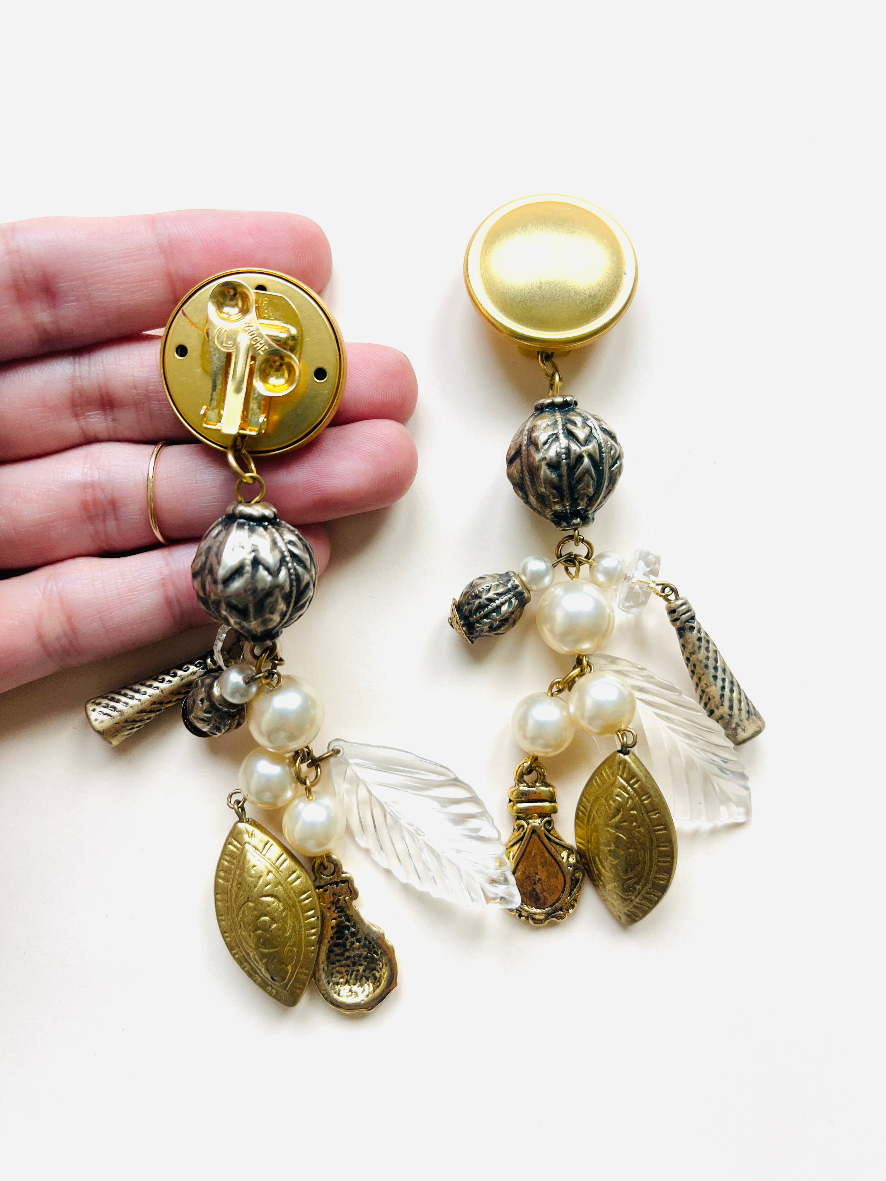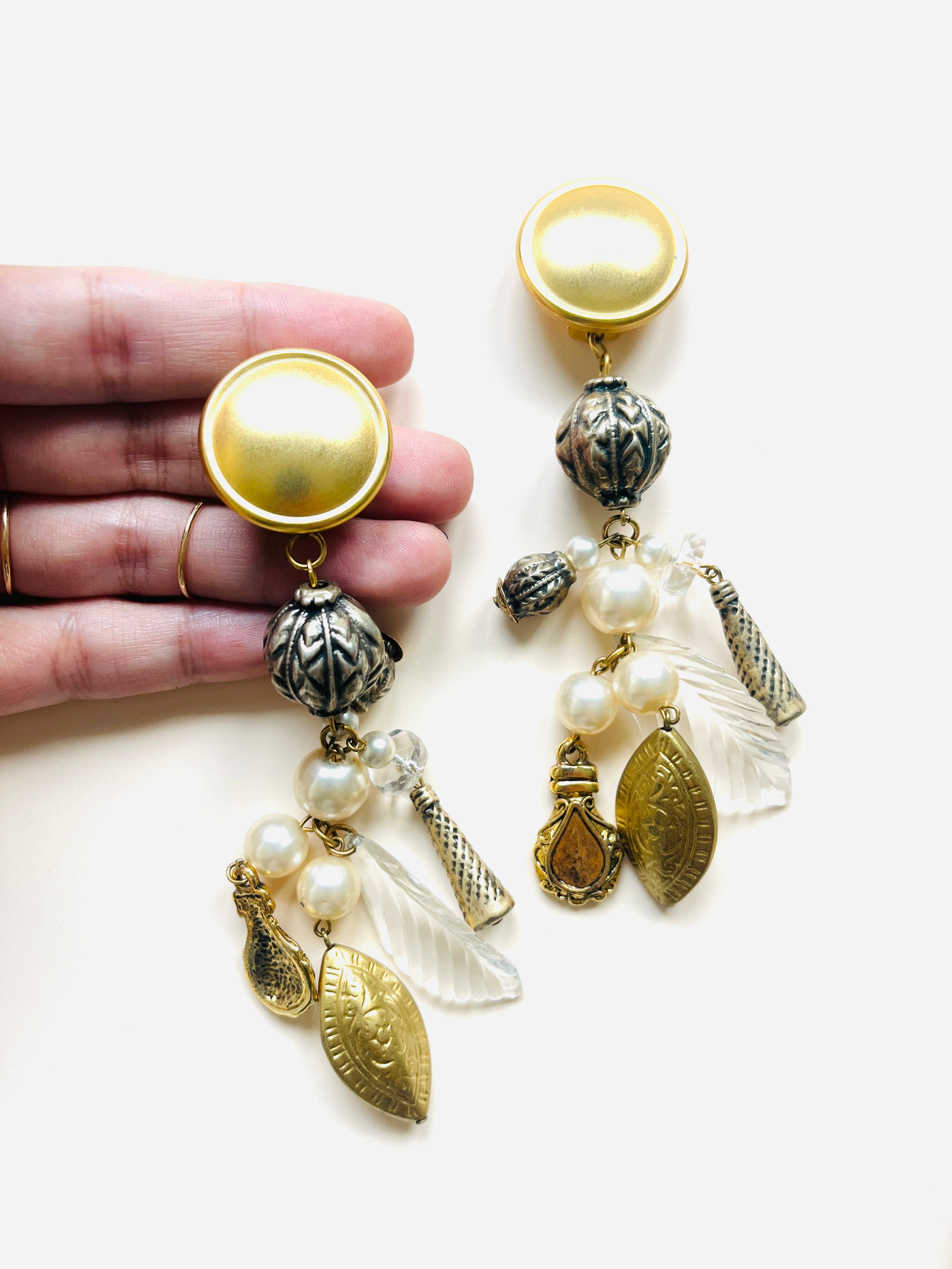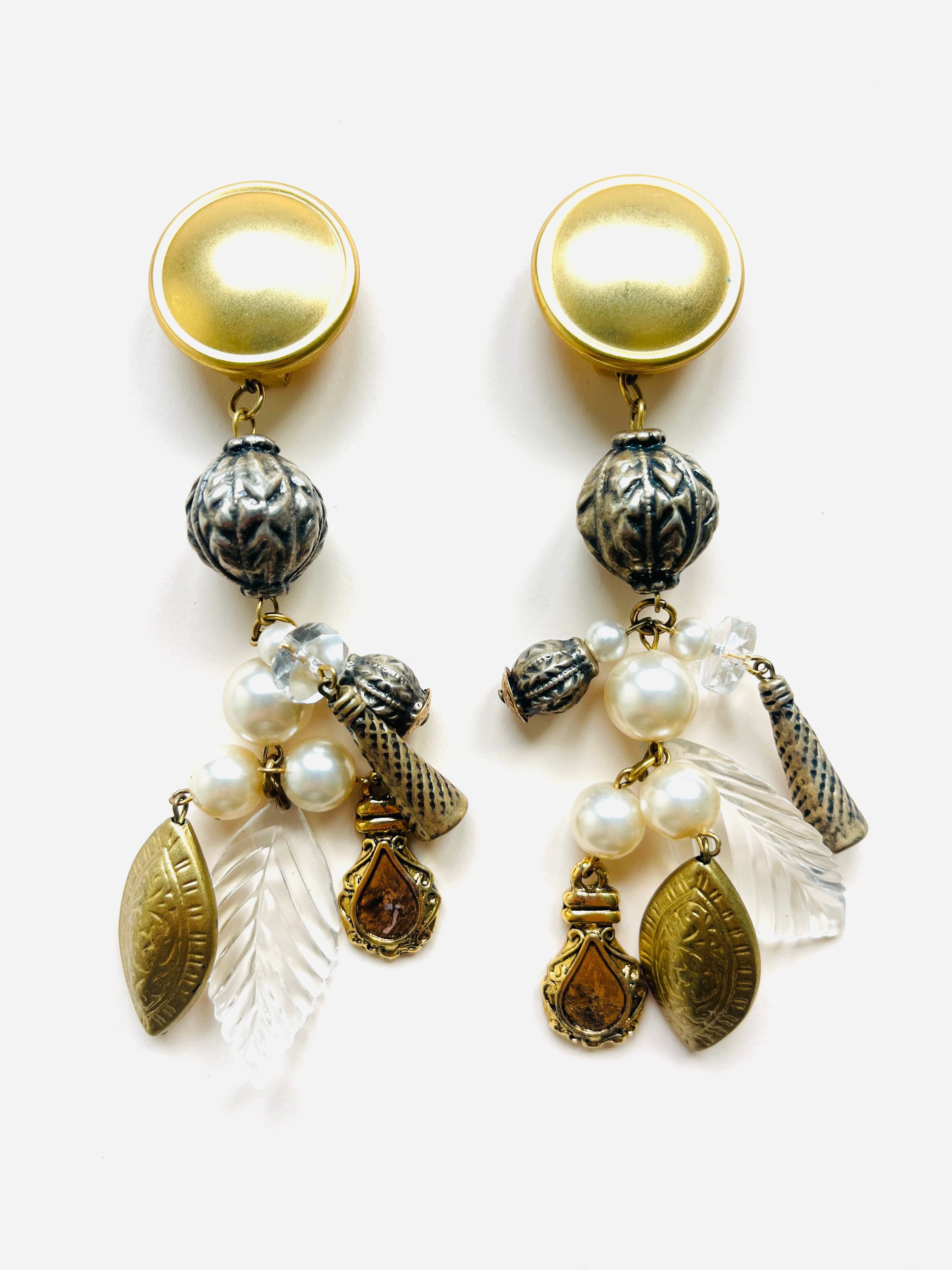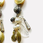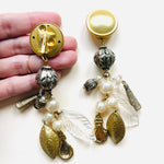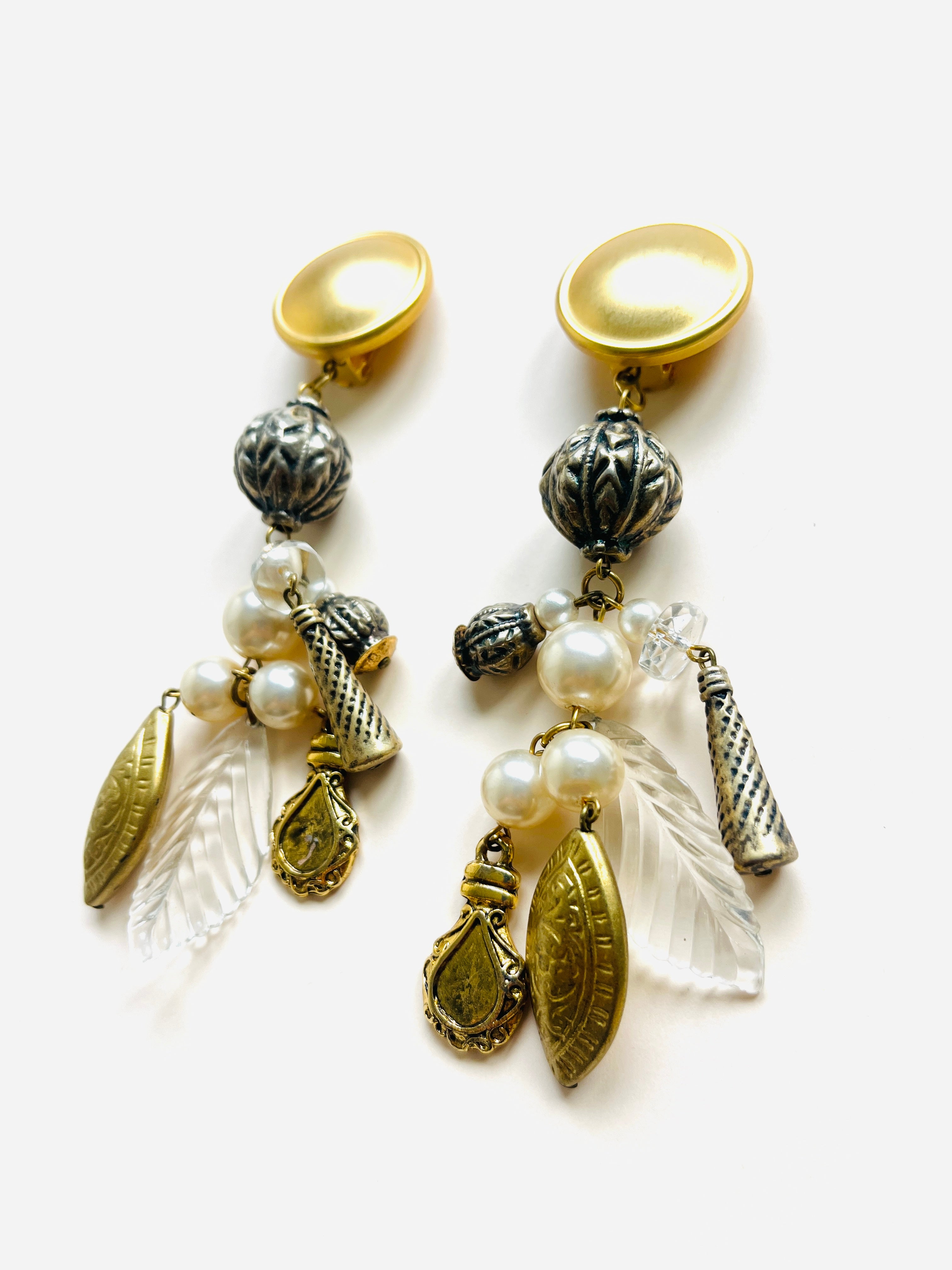 Maxi pendientes vintage originales de los años 90 con cierre de clip. Base dorada mate en forma redonda y colgante con abalorios en perla y color blanco.