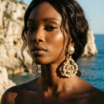 Maxi pendientes vintage originales años 90 con cierre de clip. Base dorada con cabezal redondo y colgante de perla blanca.
