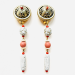 Maxi pendientes vintage originales de los años 90. Base dorada con cierre de clip y abalorios multicolor en naranja y blanco, peso ligero.