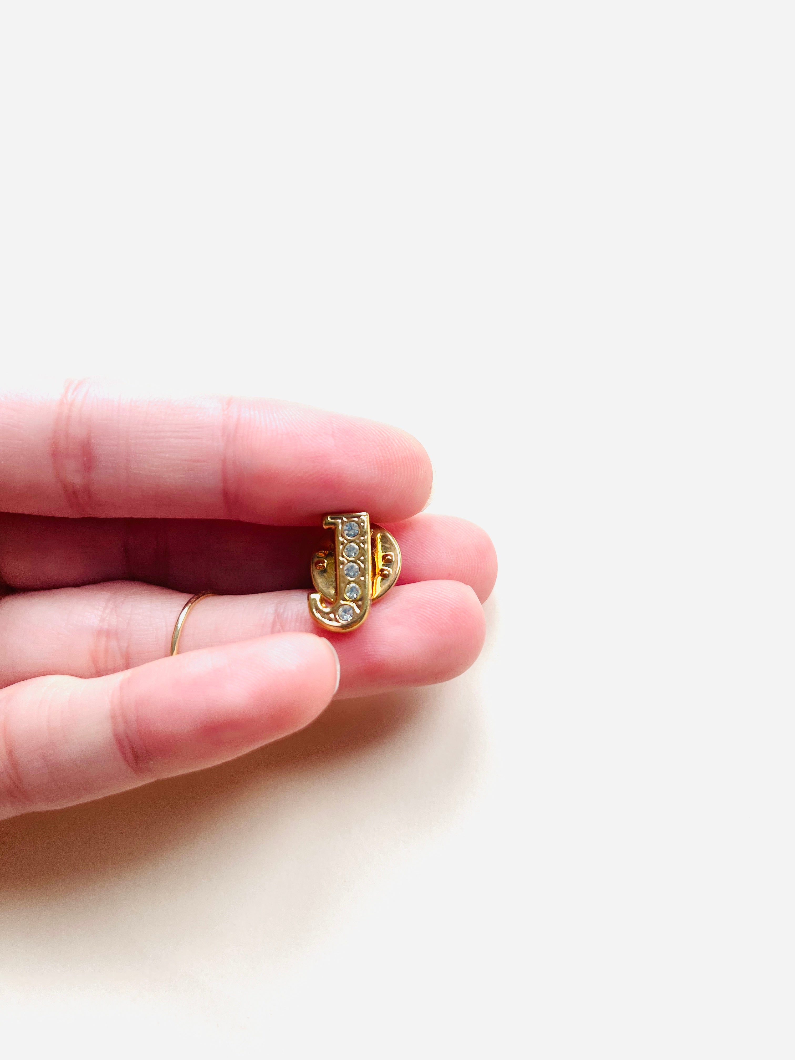 Broche vintage original de los años 90 con cierre de pin. Base dorada en forma de inicial J con apliques de en cristal blanco.