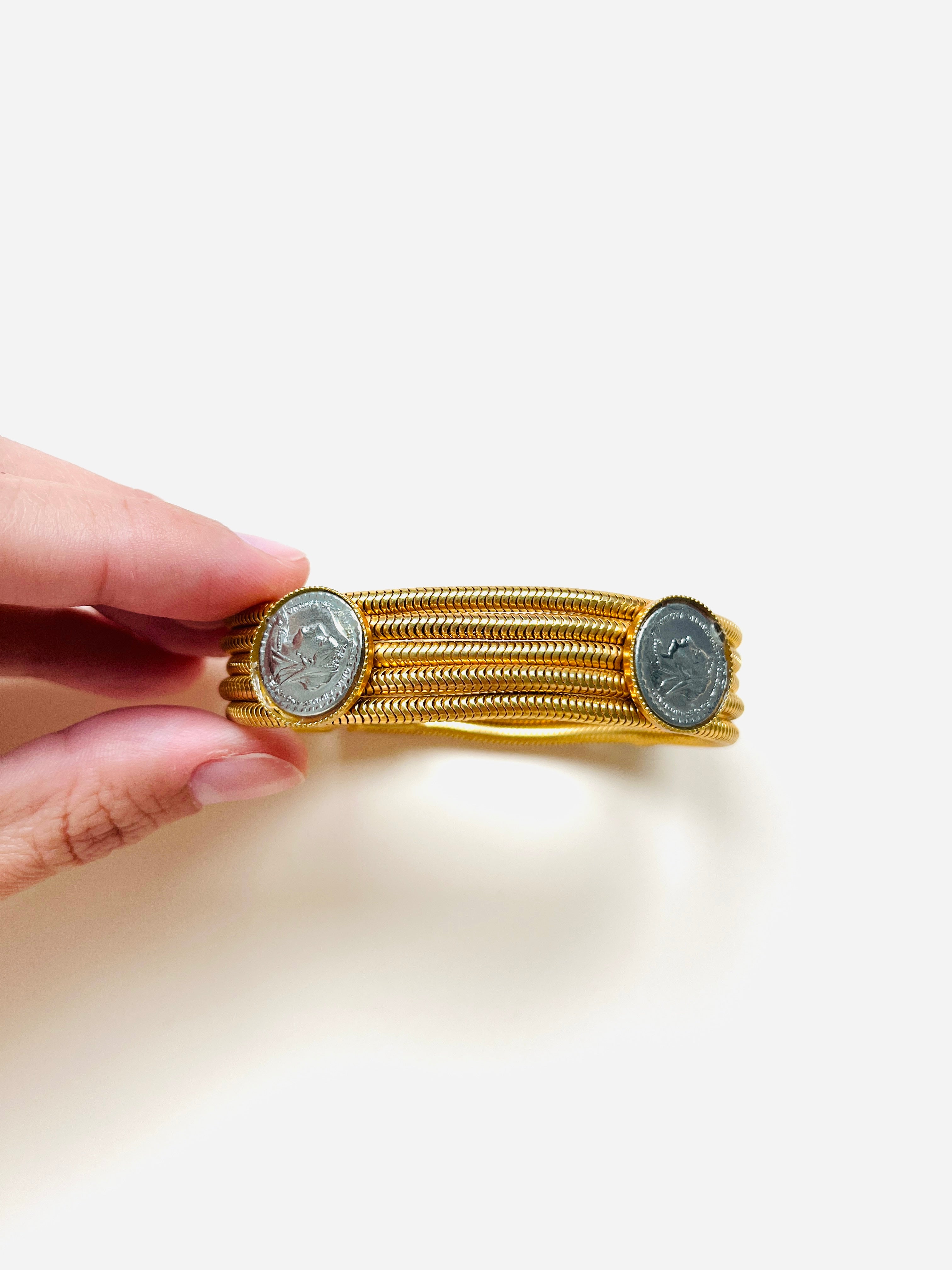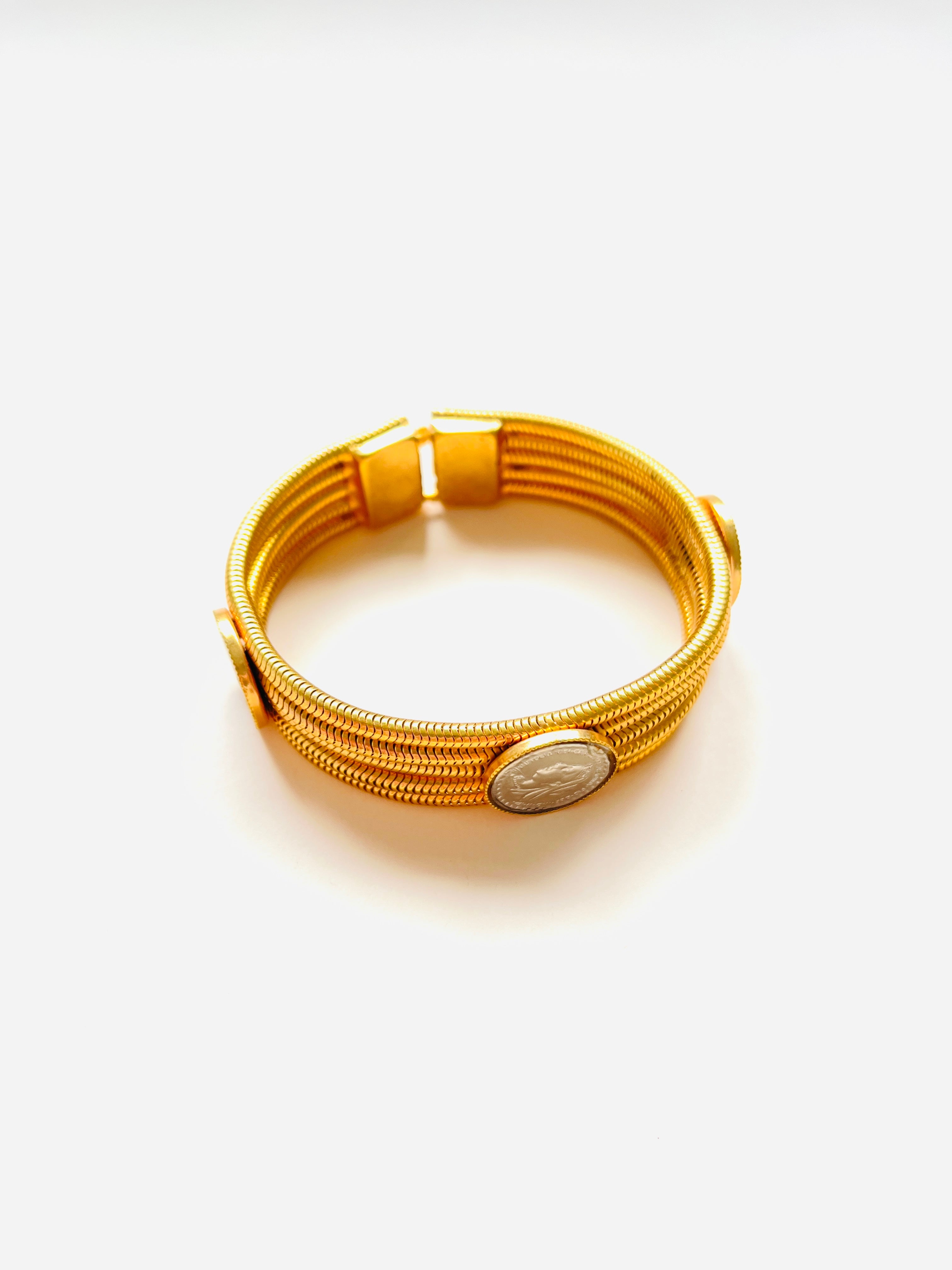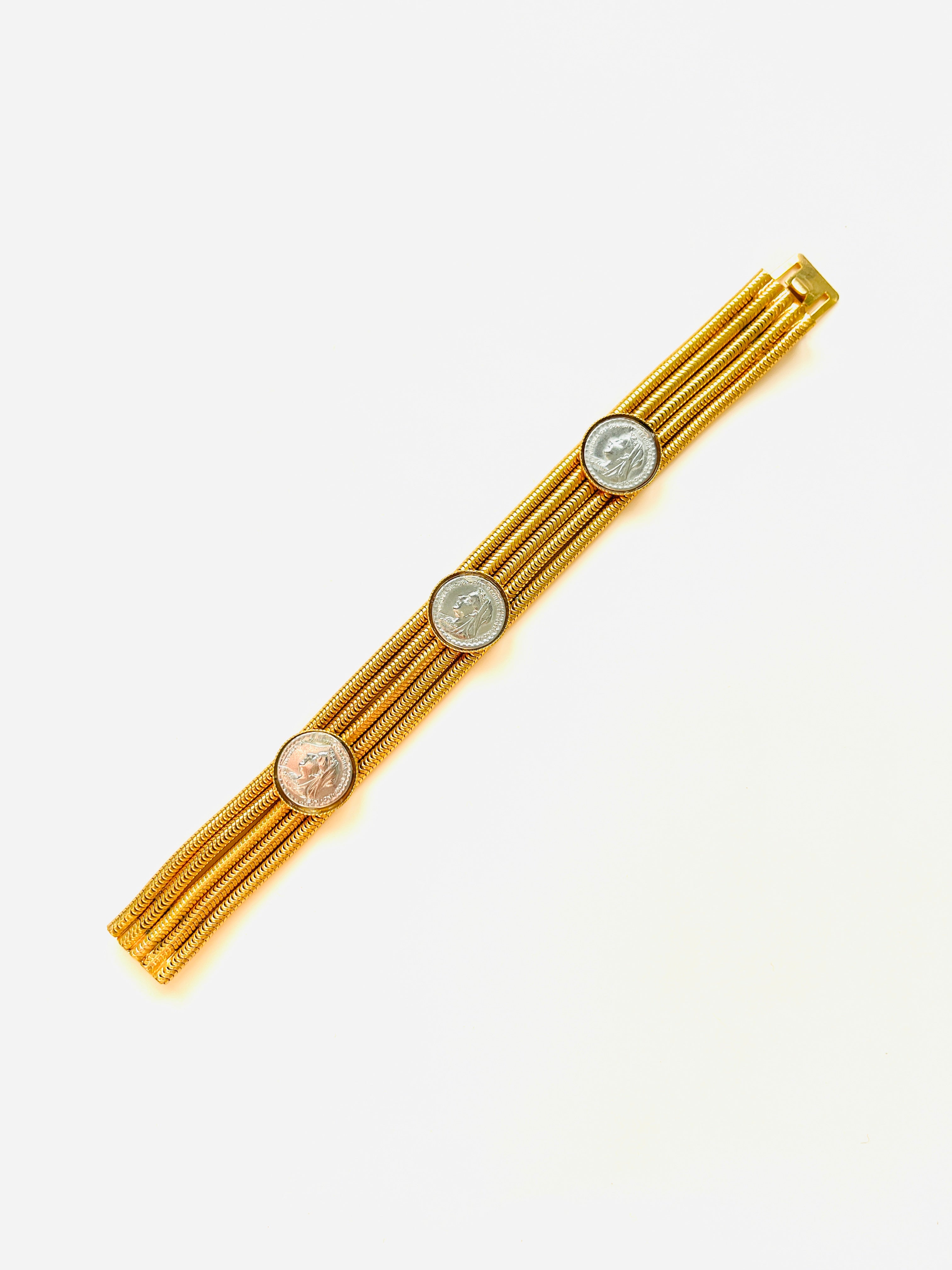 Pulsera vintage original de los años 90 dorada multicadena con detalles de monedas en plata.