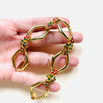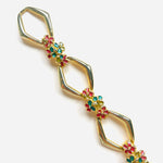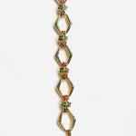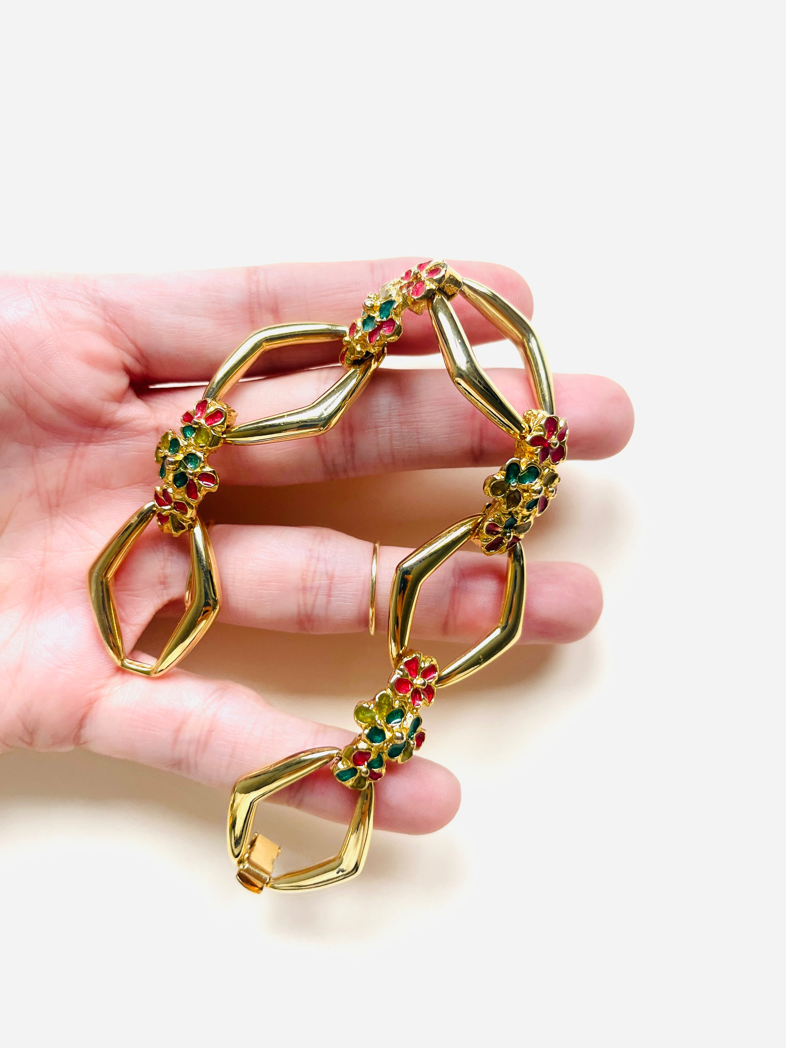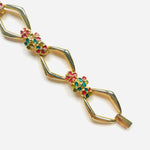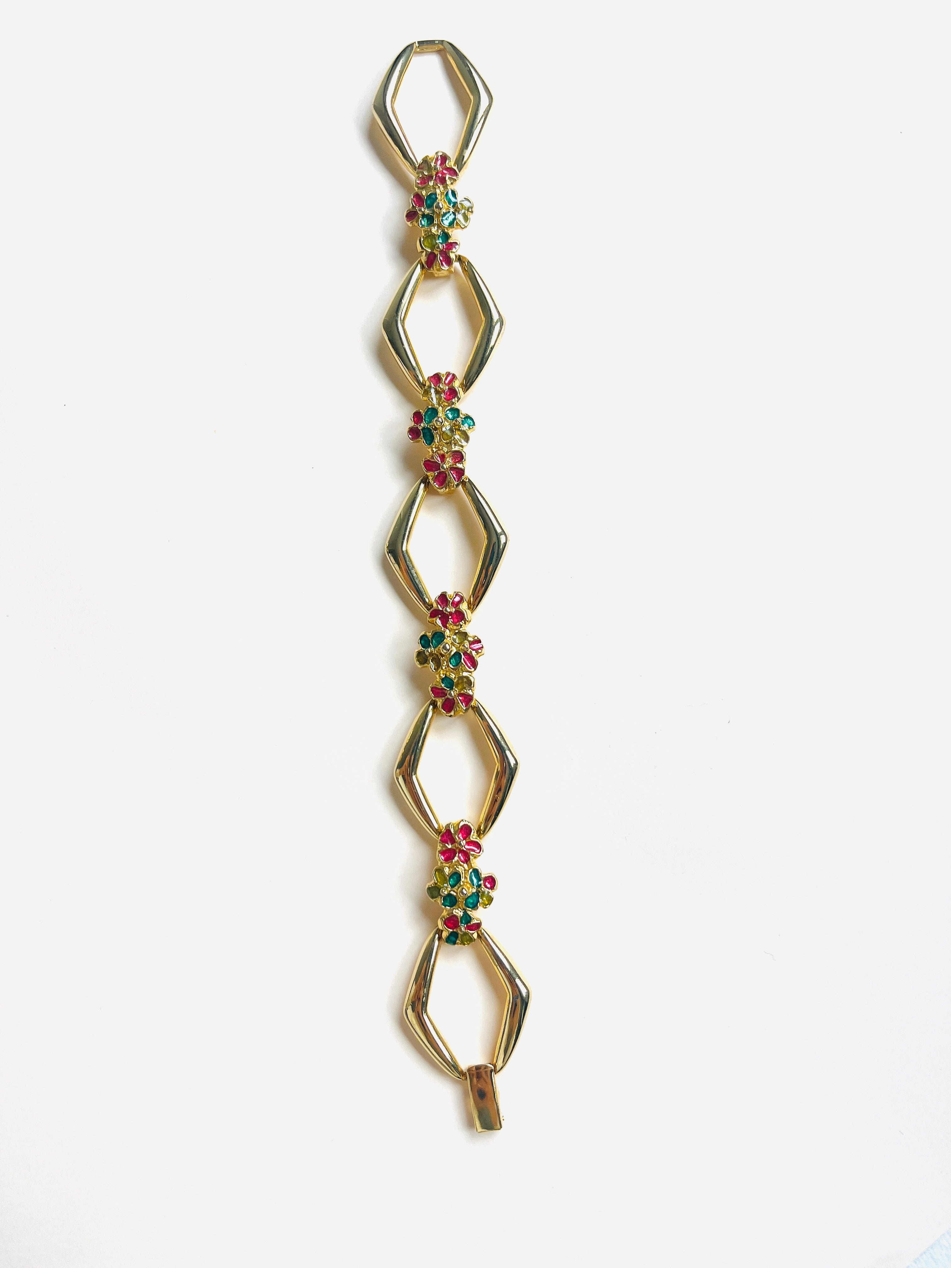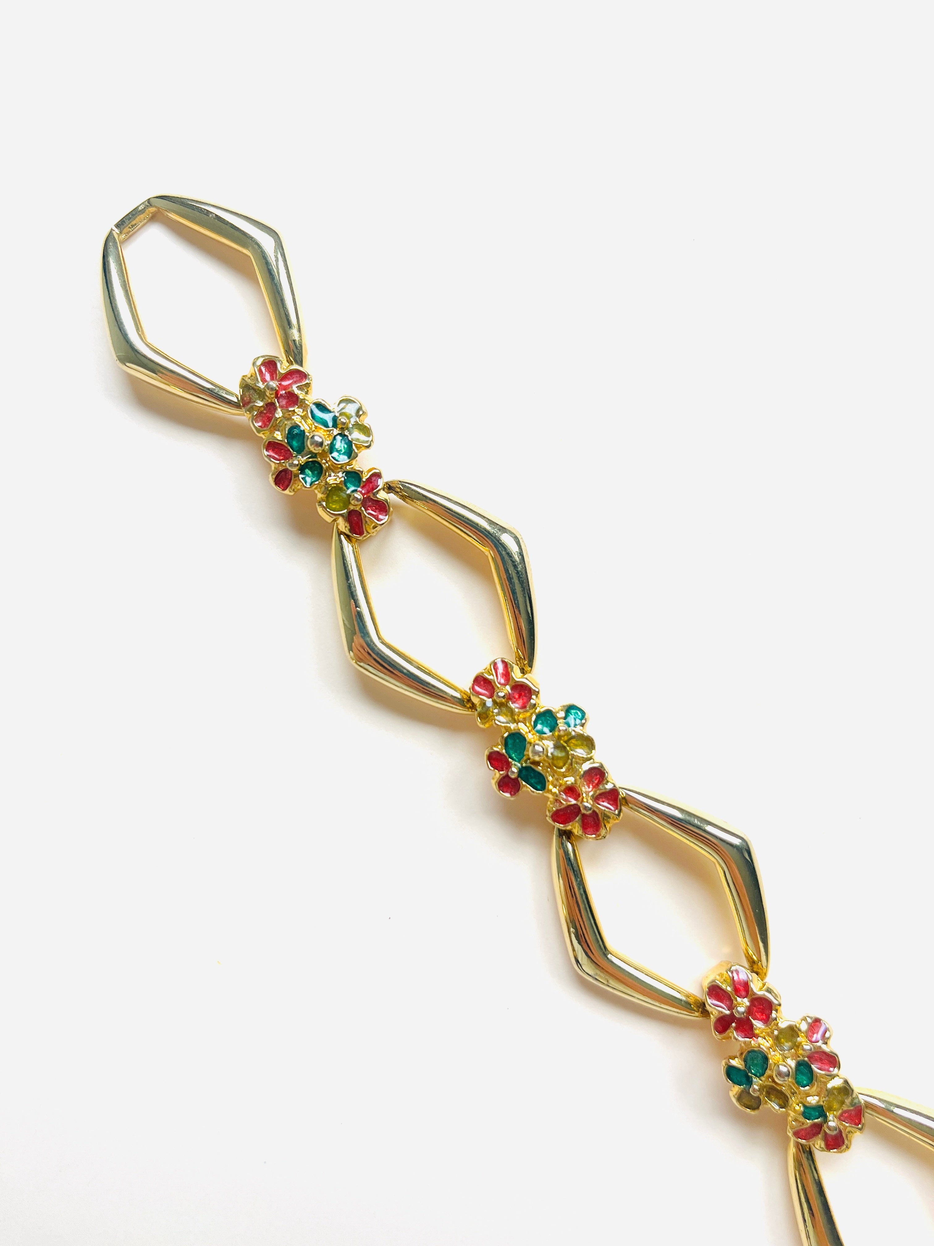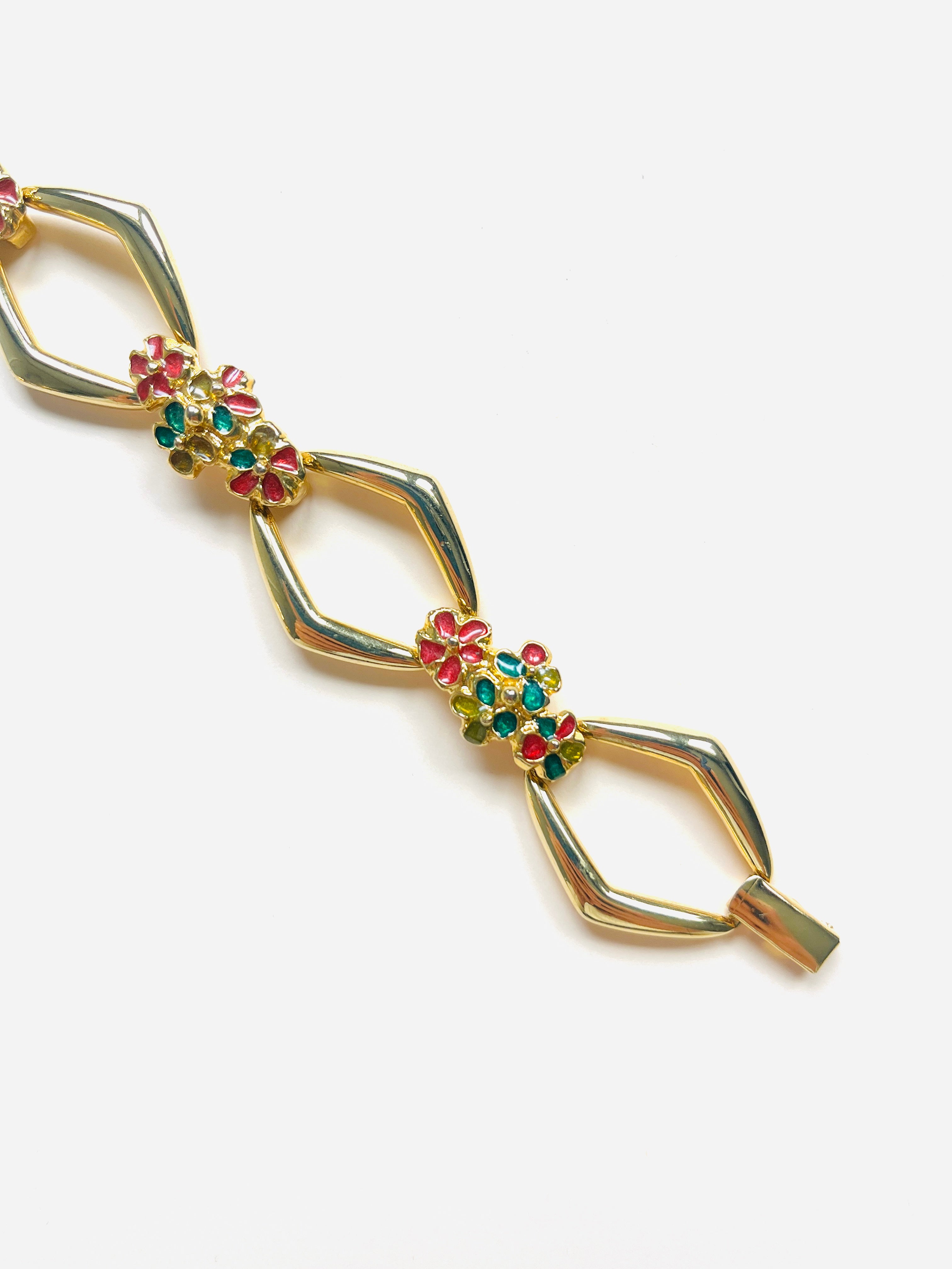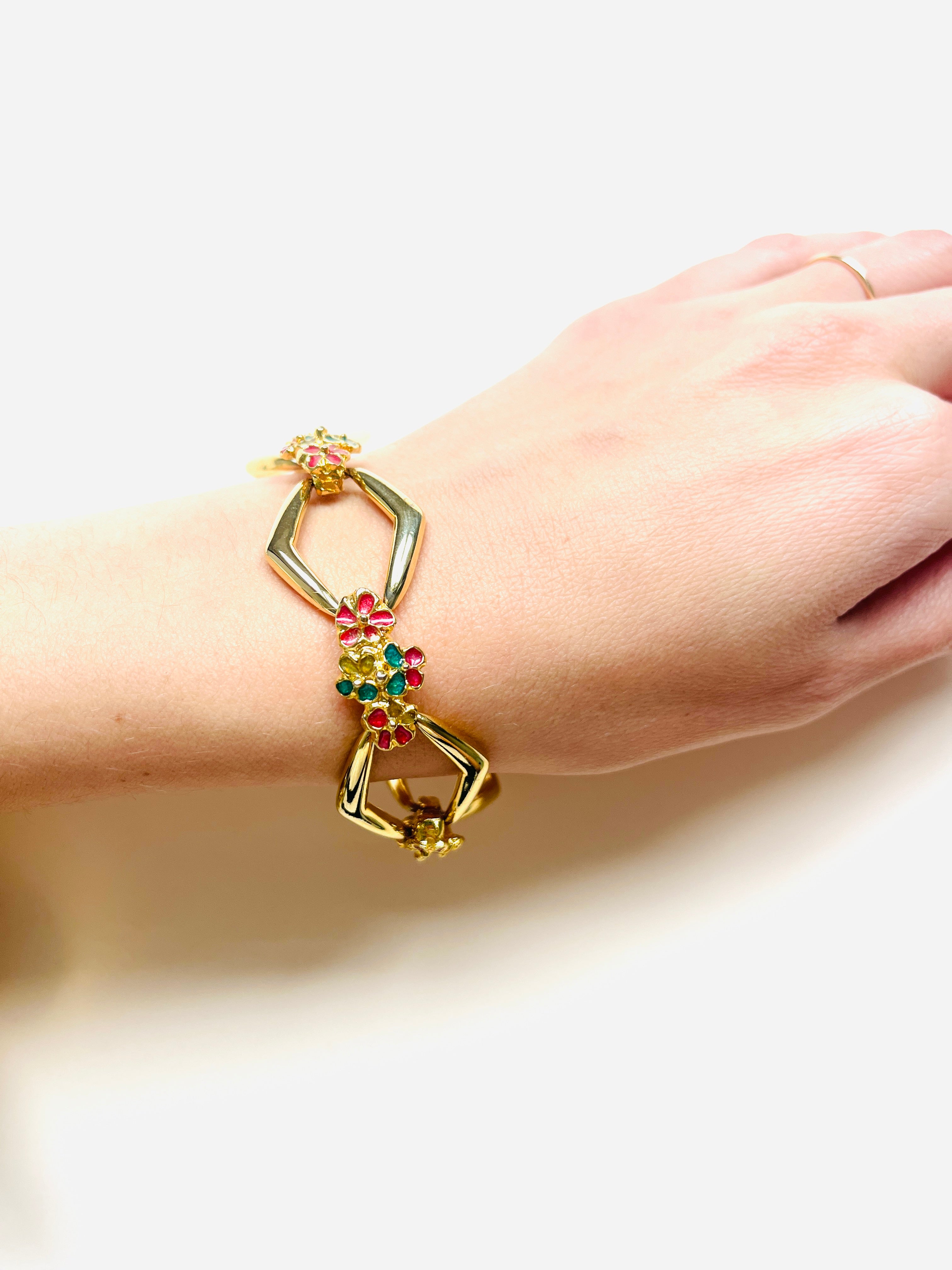 Pulsera vintage dorada original de los años 90. Base dorada con detalles en forma de flor multicolor.